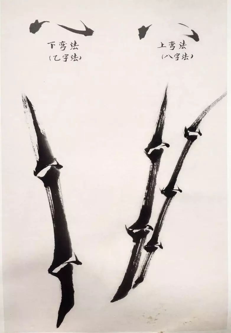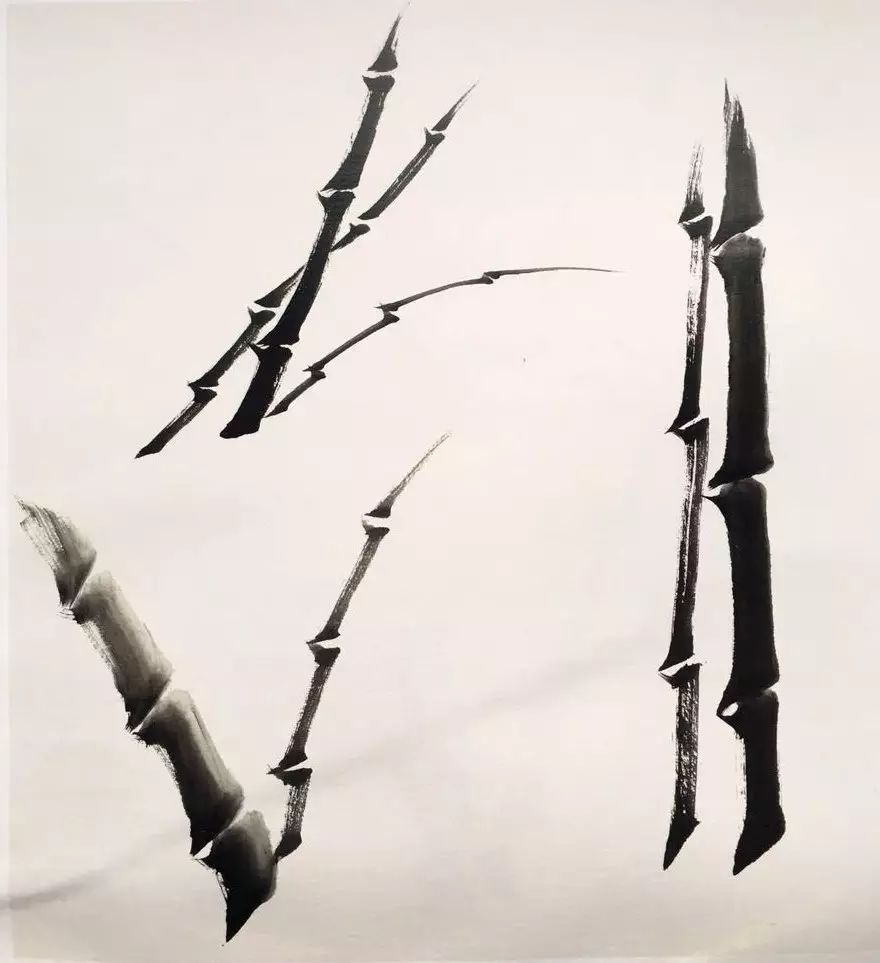墨竹寫竿,要選較硬的蘭竹筆為宜。運筆要有起、行、收的過程。行筆不可太慢,亦不可太快。中鋒行筆,可先下而上,亦可先上而下,初短后長,節節相承,筆意貫通,至稍漸短漸細。