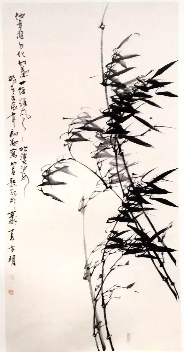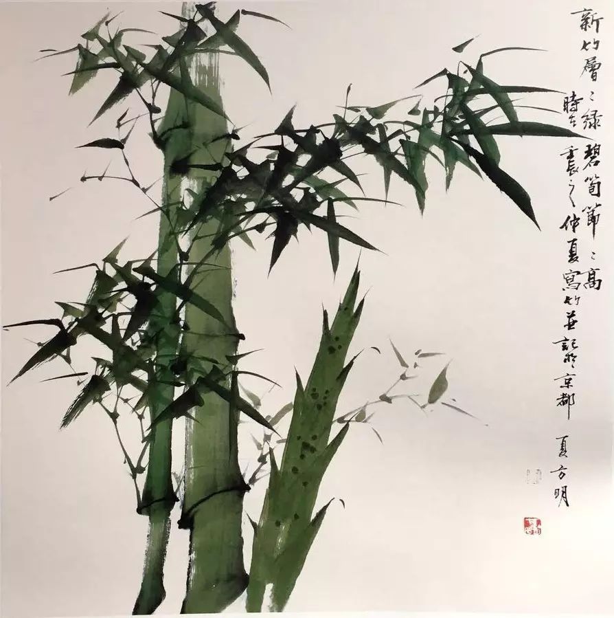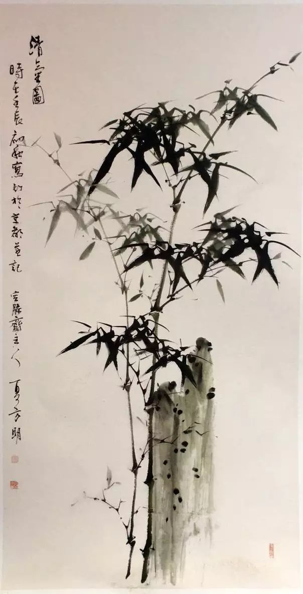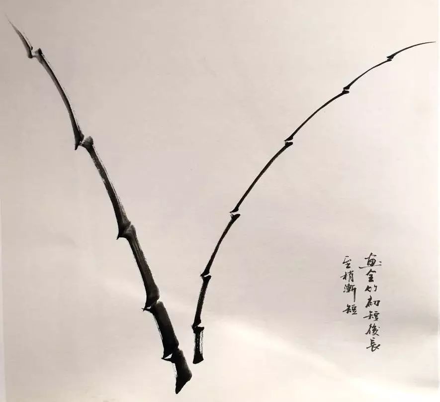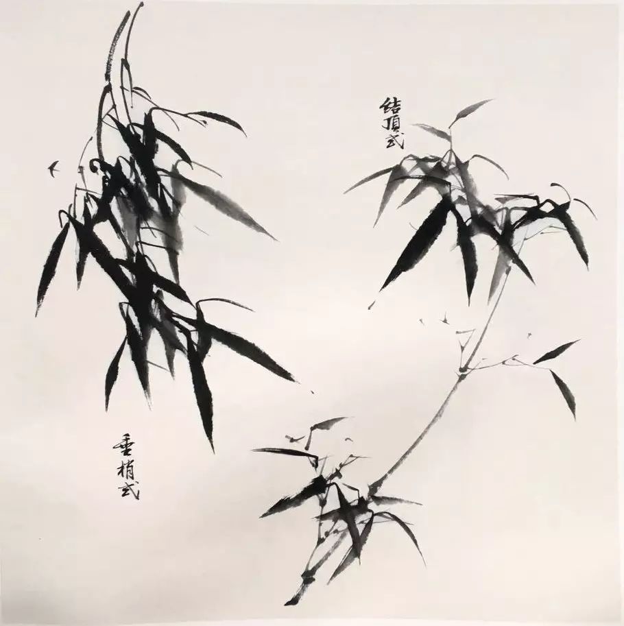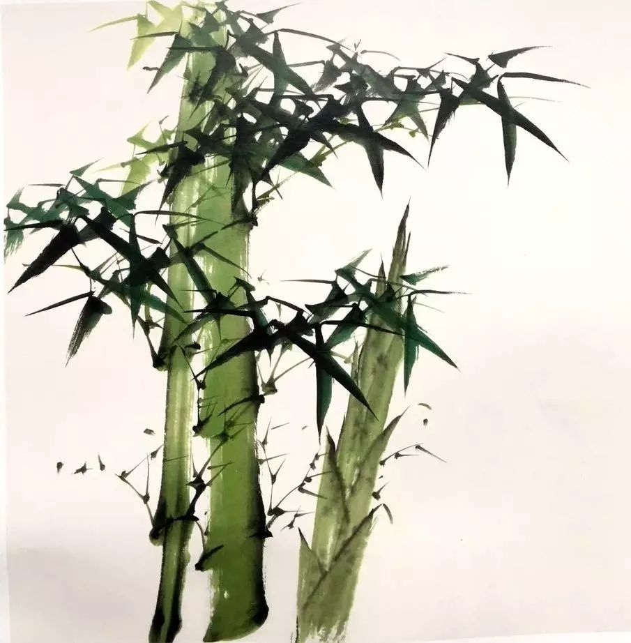 畫兩竿竹或兩竿以上時要注意:一是忌平行,竹節要錯開;二是交叉忌垂直,更忌多竿交于一點;三是一般情況下畫竹要求彎節不彎竿,但亦不可太直,太直則僵,要有一定弧度,才能表現出竹竿的彈性;四是多竿竹時要注意濃淡虛實的變化。