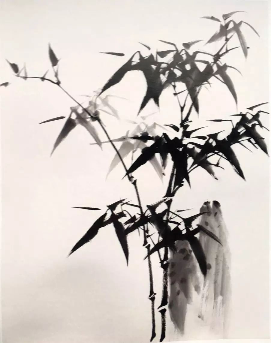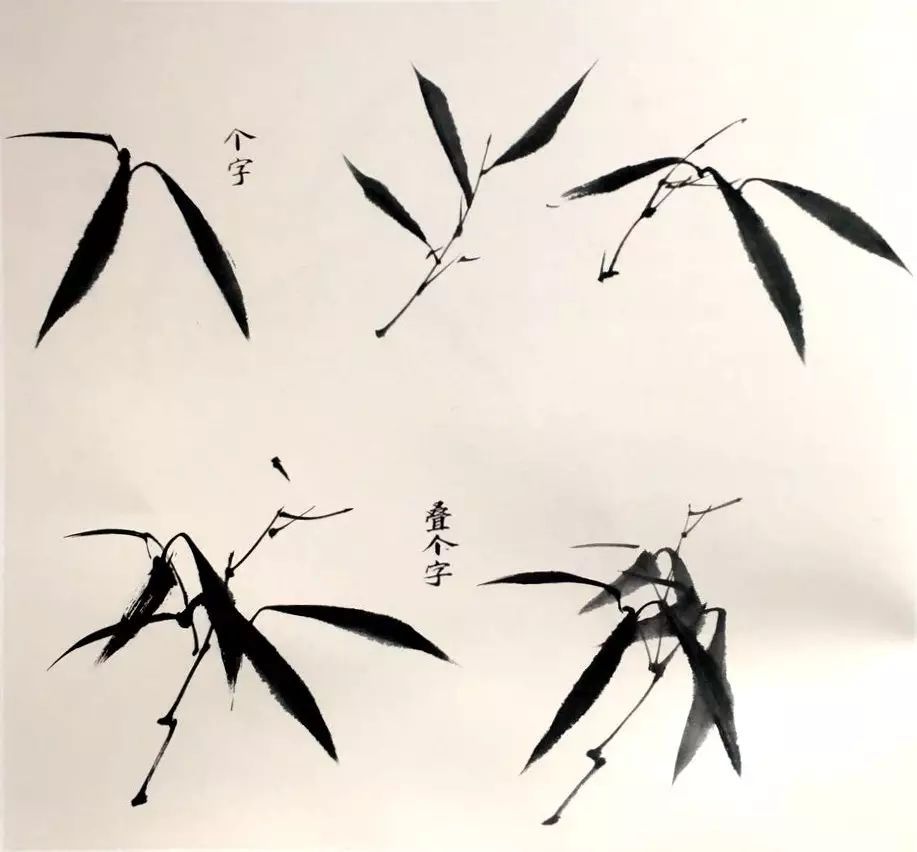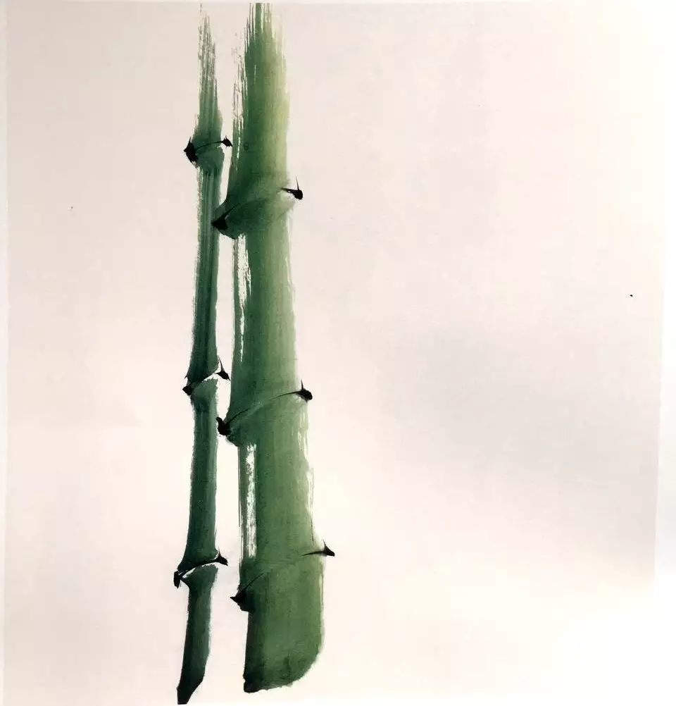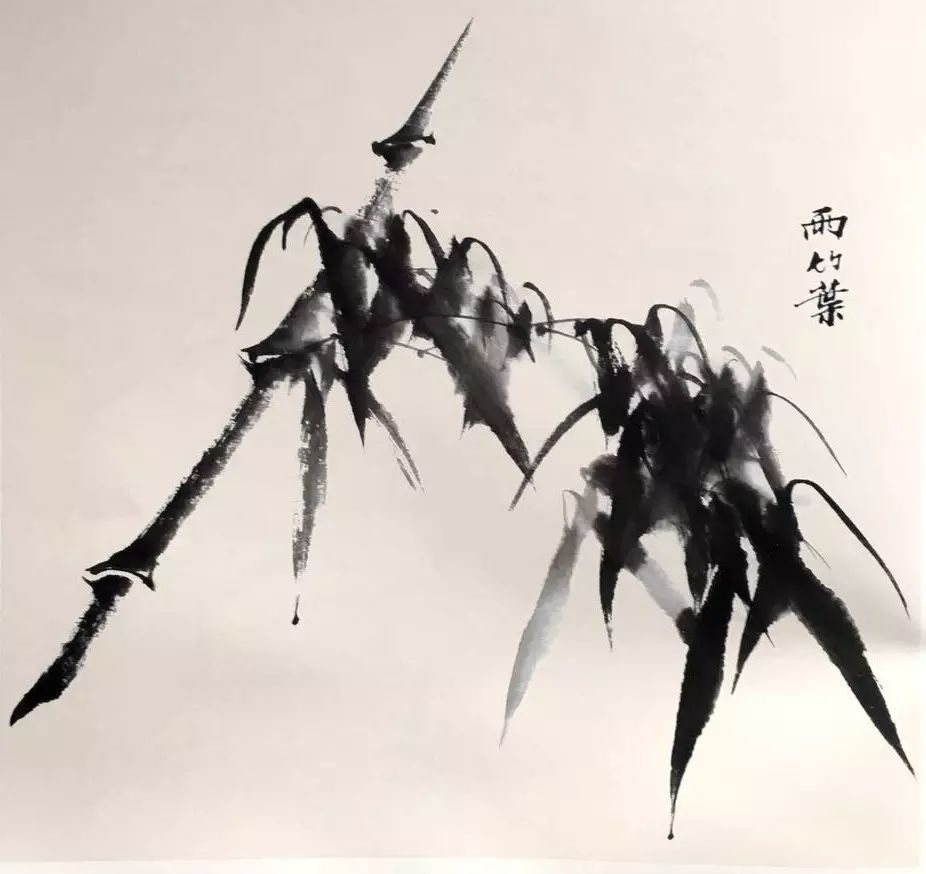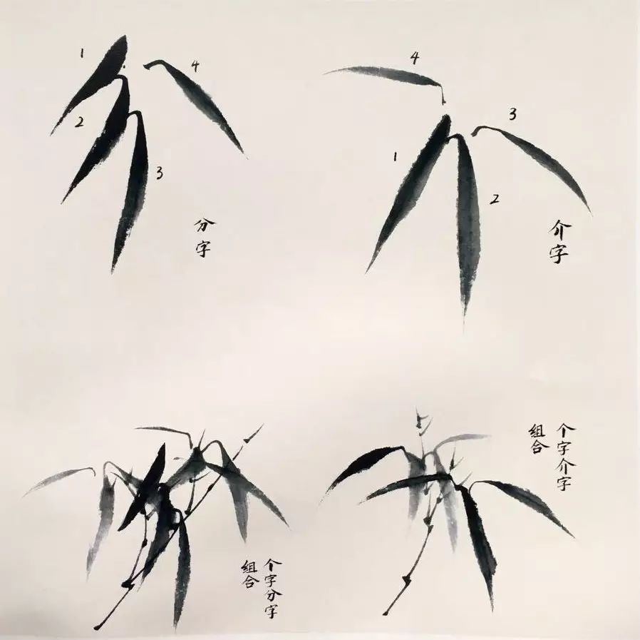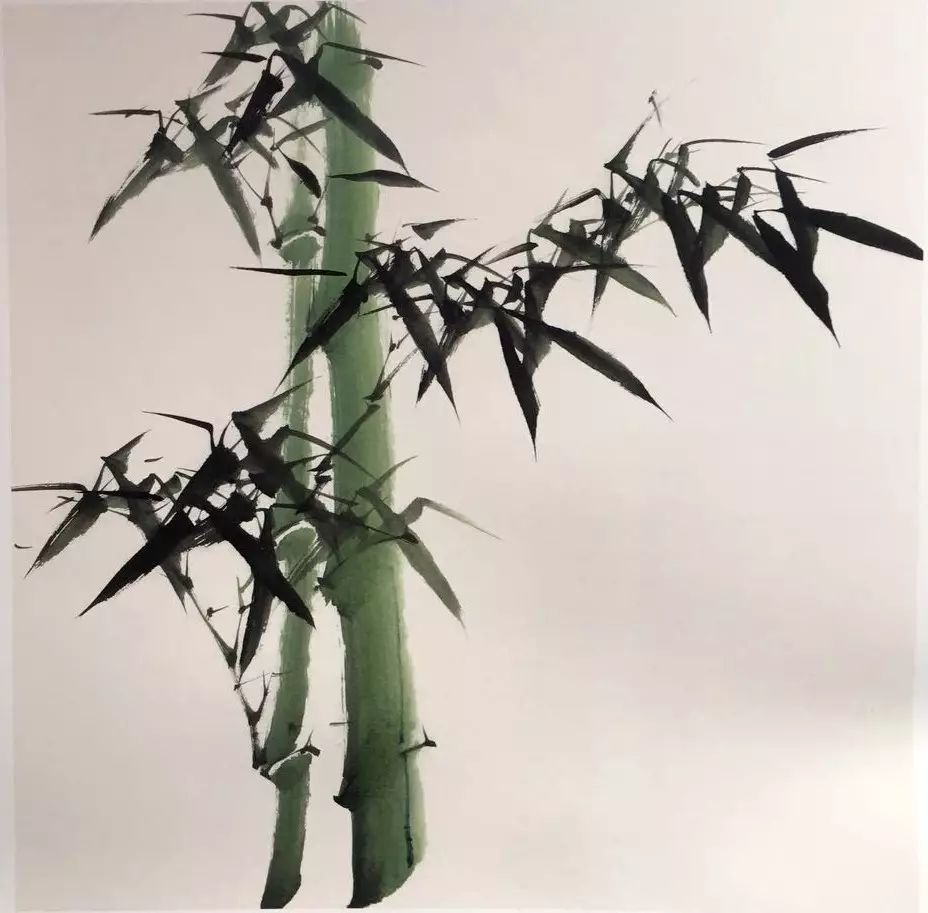 畫竹先立竿,一竿之出基本決定了畫面的布局,粗竿多用淡墨,用筆要挺撥,一竿直上干凈利落,不可呆滯停頓。先出主竿控制好畫面,再用稍微濃點的墨畫出分枝,小枝能決定竹葉的位置,雖然很多小枝稍最后蓋都被竹葉所覆蓋,但是出小枝也不能馬虎。竹葉的表現多以“個”“介”字為基礎,運用這個程式不能過分刻板,既要有排列,也要有長短變化進行打破,這樣一組葉子才能生動。