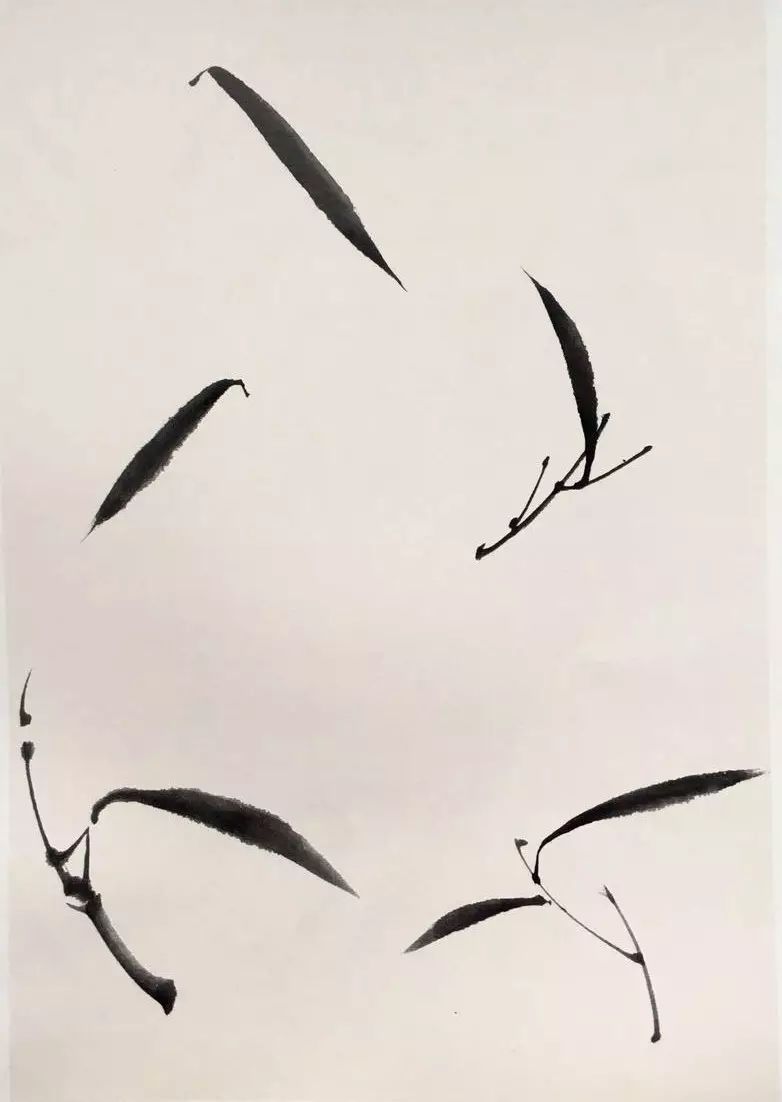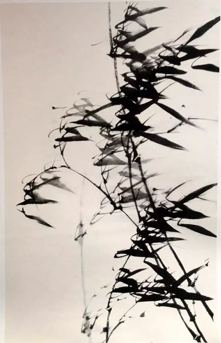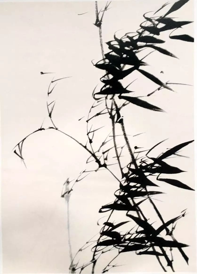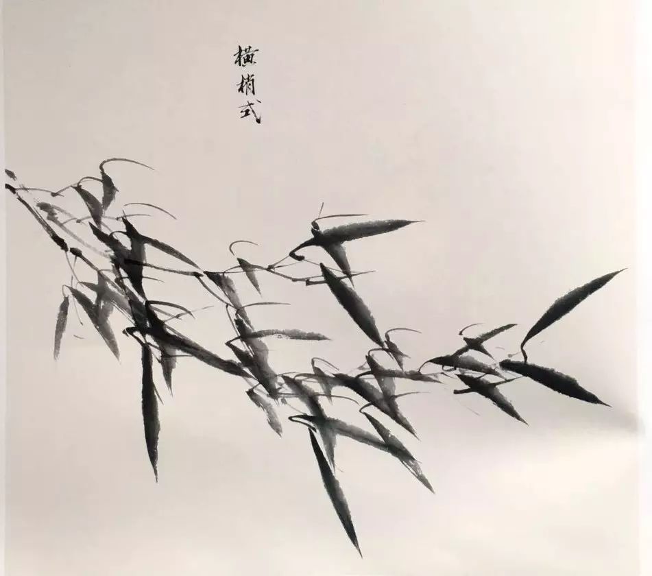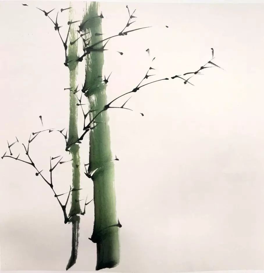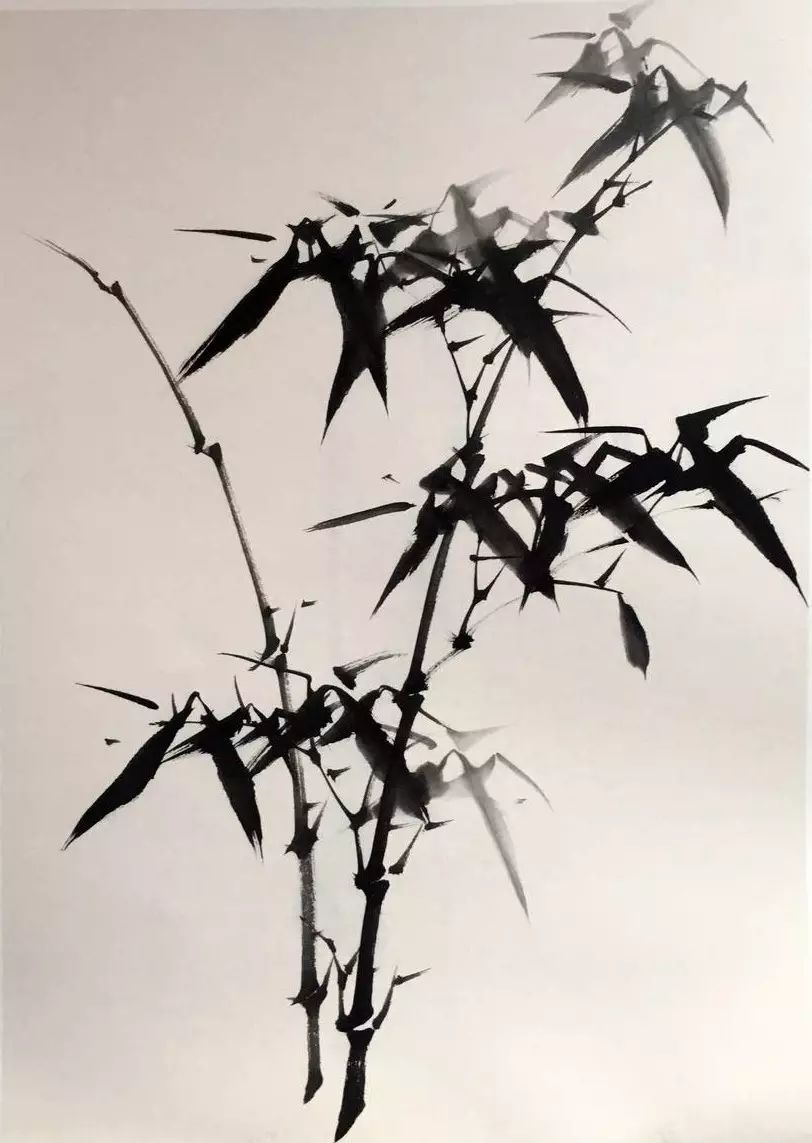 畫竹先立竿,一竿之出基本決定了畫面的布局,粗竿多用淡墨,用筆要挺撥,一竿直上干凈利落,不可呆滯停頓。先出主竿控制好畫面,再用稍微濃點的墨畫出分枝,小枝能決定竹葉的位置,雖然很多小枝稍最后蓋都被竹葉所覆蓋,但是出小枝也不能馬虎。竹葉的表現多以“個”“介”字為基礎,運用這個程式不能過分刻板,既要有排列,也要有長短變化進行打破,這樣一組葉子才能生動。