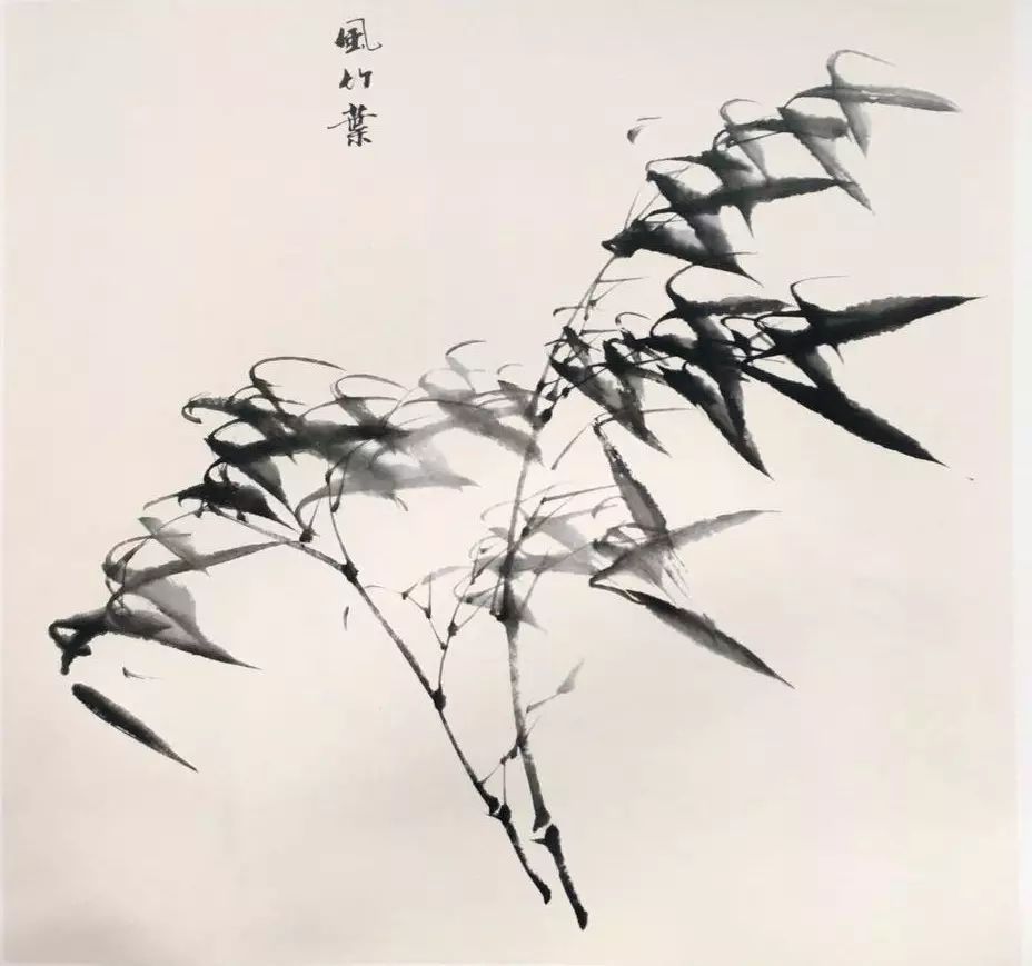 3、涮干凈筆后,蘸適量清水,再蘸淡墨,筆尖飽蘸濃墨,盡量使筆上墨色由下至上為濃、淡、清,快速寫風竹葉,直到一筆顏色全部用完再畫下一筆。葉子墨色會出現自然的濃淡干濕變化。