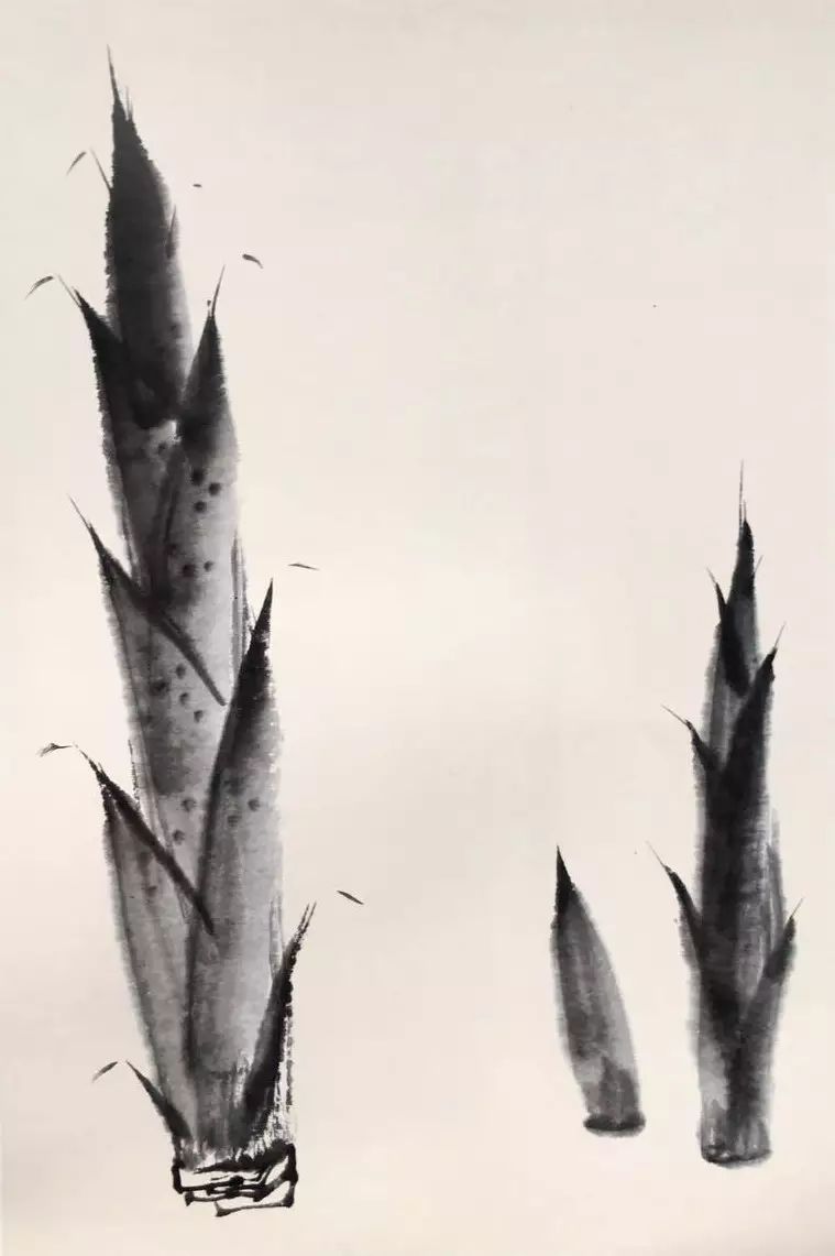 竹筍用筆要按籜片的結構,側鋒用筆,一左一右,交互寫下來。所有竹筍的基本結構是一致的。筍中有節,節外有竹籜包著。由于竹子種類不同,其竹筍外部形狀也各有不同。