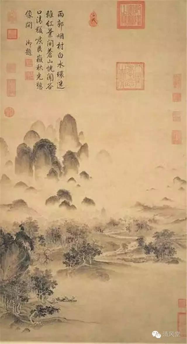 題跋:雨郭煙村白水還,迷離紅葉間蒼山?;新劰瓤谇逶赤?,艮岳秋光想像間。
