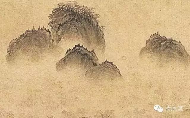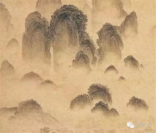 群山疊嶂被壓縮、聚集在畫面左上角,已經失去原本撼人的氣勢,畫家使用大量水墨淡染來呈現煙霧迷離的山水景色,頗有韻致,亦能增添畫面的流動性。