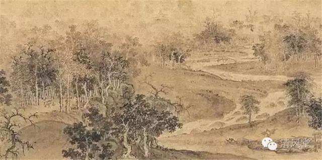 列植于平坡、沙渚的群樹,枝干挺直,畫葉用濕筆點染、樹干留白,筆墨中帶有拙趣,此類表現與院藏巨然〈層巖叢樹圖〉的林木相似,顯示這件作品亦受到江南畫風的影響。