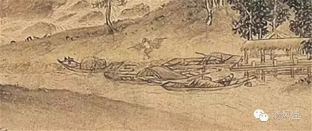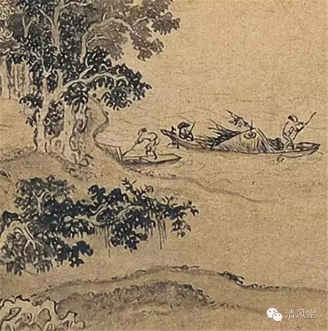 細看這幅畫的點景人物,多半描繪漁夫在漁釣或捕魚的情景,這代表著君子所向往與世無爭、遠離塵俗的生活典型。此類漁父的畫題,在進入北宋之后逐漸流行,成為山水畫不可或缺的重要題材。