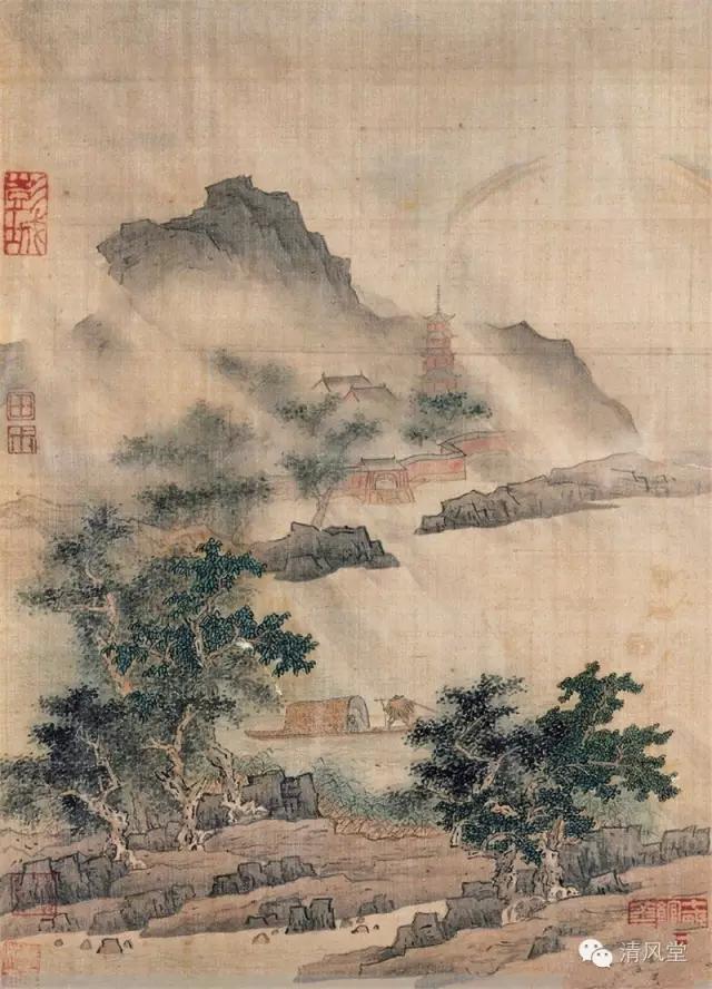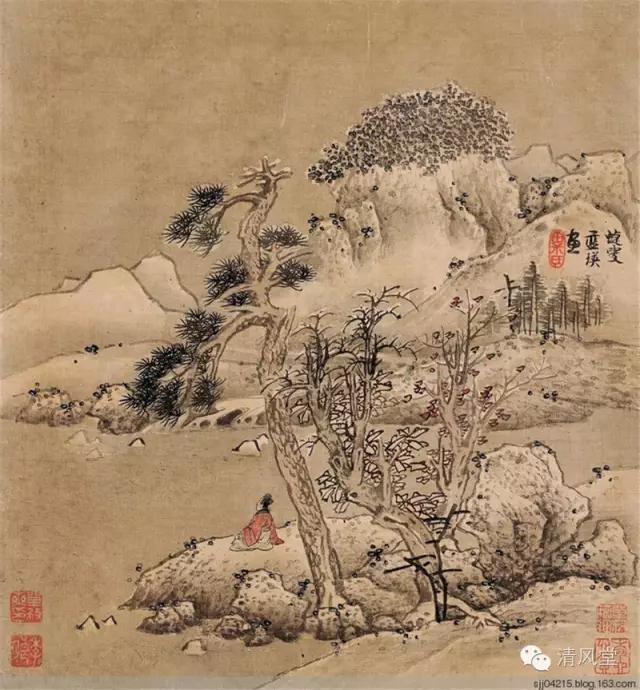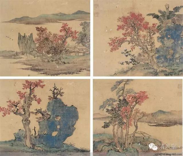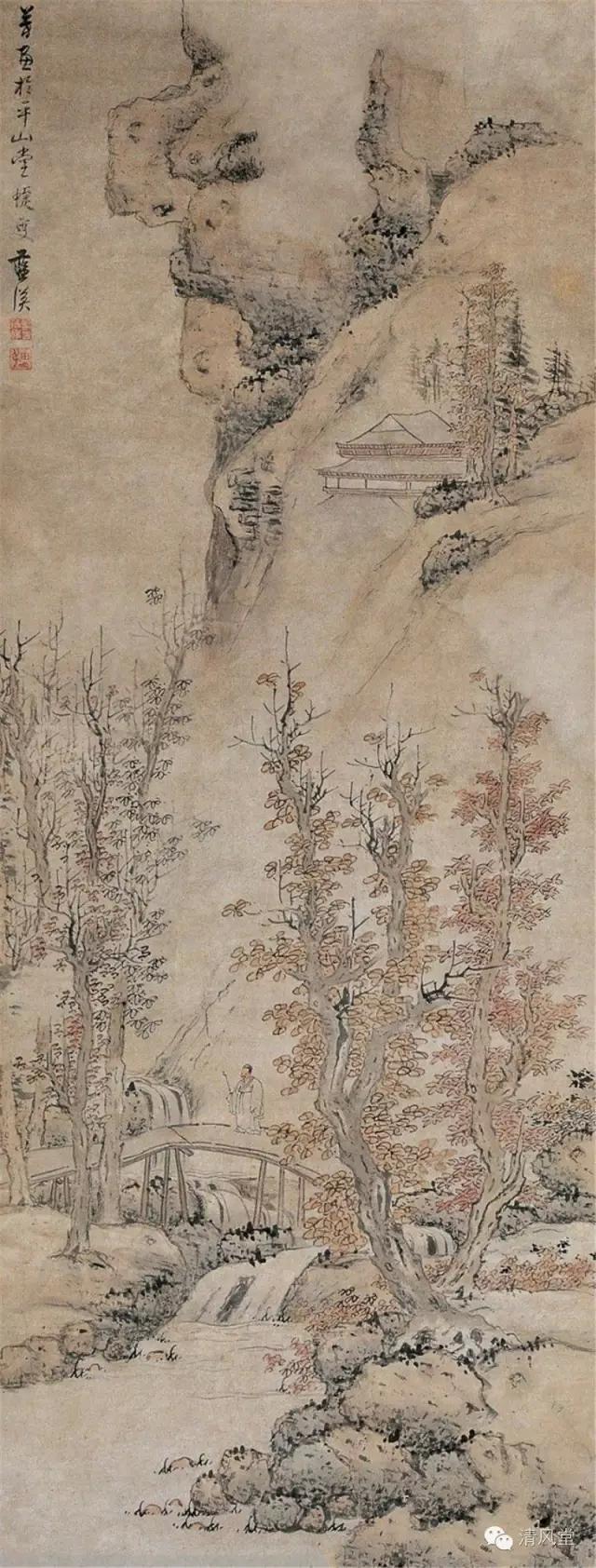 縱觀藍(lán)瑛早、中、晚三個時期的繪畫作品,大體可以得到這樣一些認(rèn)識:早年的作品,是學(xué)宋代諸大家的筆法,尤其是學(xué)元四家的作品。此時筆法較細(xì)潤,明顯地呈現(xiàn)出某派的筆法痕跡。中年,在學(xué)習(xí)前人技法的基礎(chǔ)上開始變法,也就是向開創(chuàng)獨(dú)特風(fēng)格的途程上逐步邁進(jìn)。晚年則開創(chuàng)了一種雄偉渾穆的獨(dú)特面貌,畫不離苔以及多畫秋景,善施赭色,巧用荷葉皴等等,也都是藍(lán)瑛作品的特點(diǎn)。