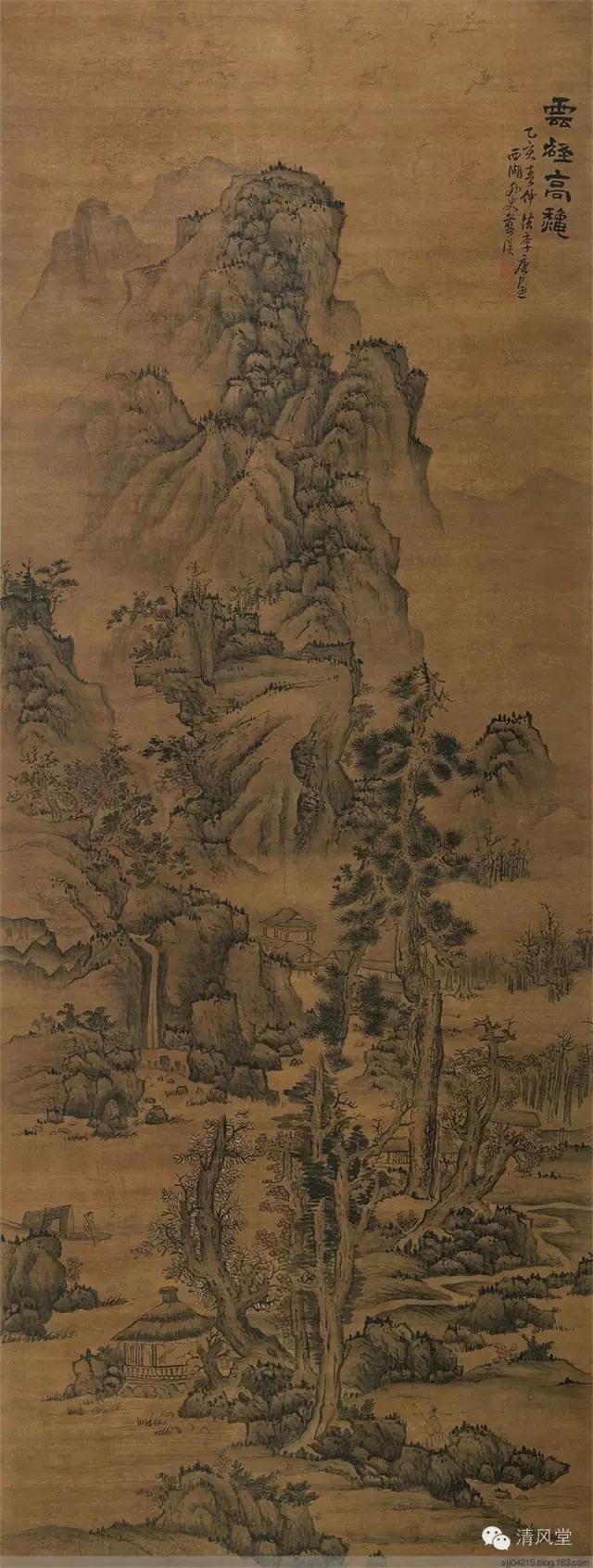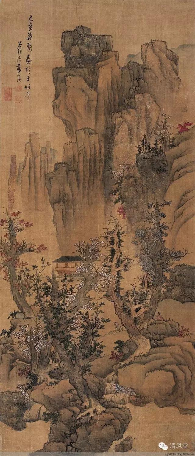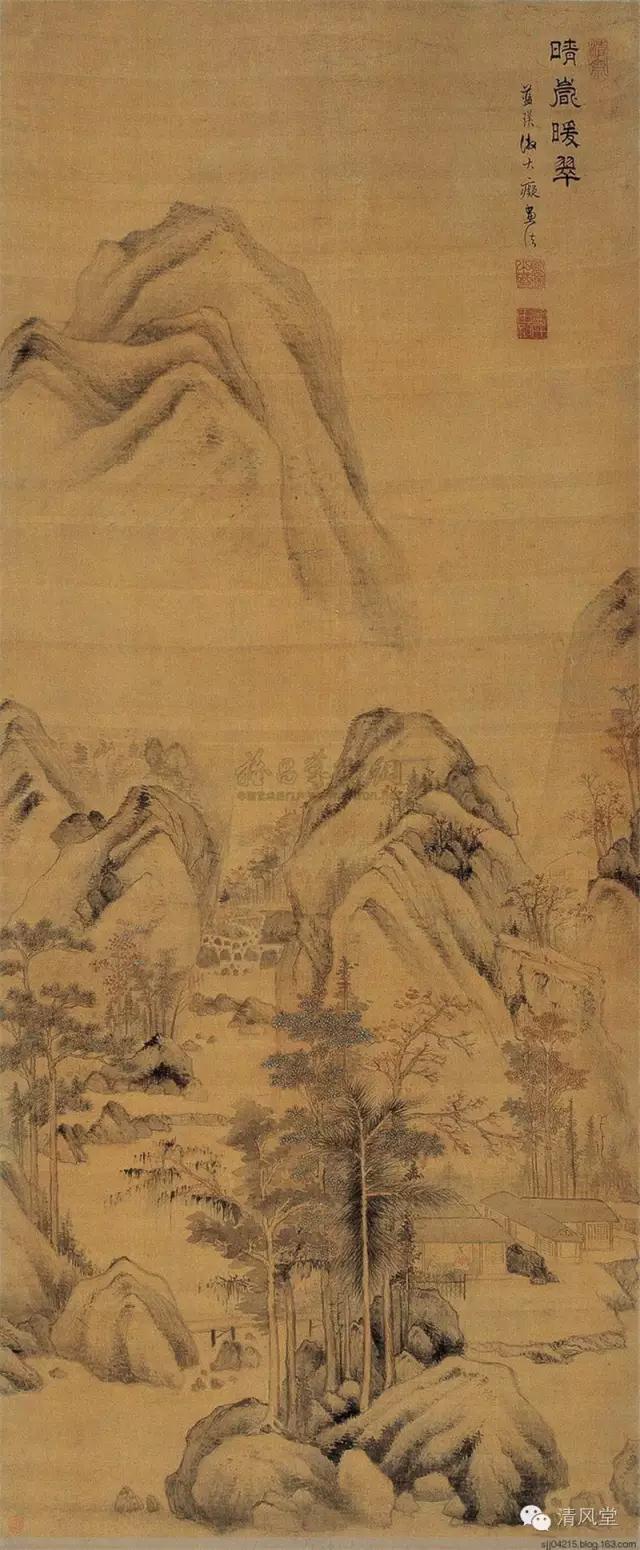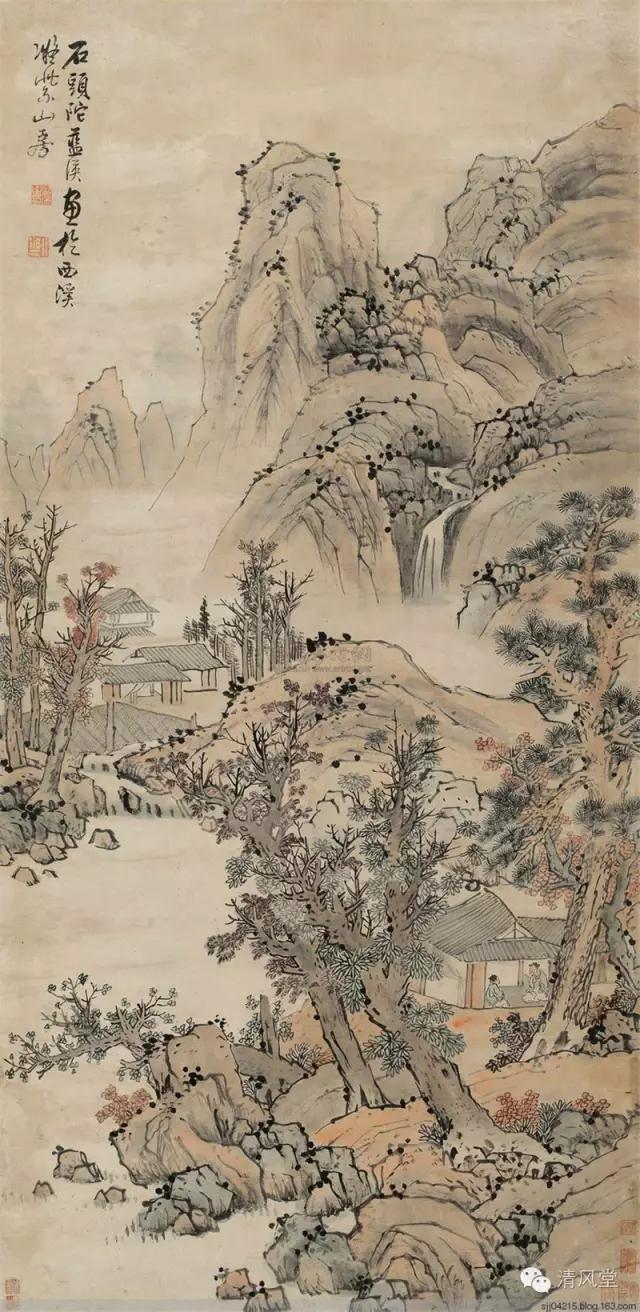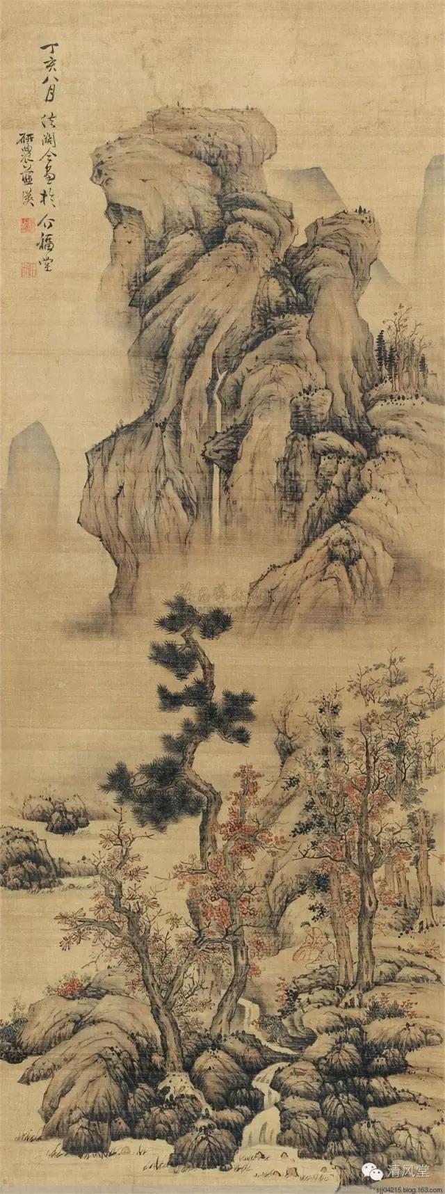 中期為五十至六十五歲之間。這時他不但取法郭熙、李唐及馬遠(yuǎn)、夏圭,而且對二米、云山也精心研究,對黃公望的畫更是悉心尤力。時人吳門畫派沈周、文徵明的筆法他也熱心師效。加之他漫游南北涉獵廣泛,眼界寬廣,兼融南北,形成了蒼勁雄強(qiáng)、骨力剛硬的個人風(fēng)格,此時的藍(lán)瑛已經(jīng)達(dá)到能“分別宋元家數(shù),某人皴梁法脈,某人蹊徑勾點(diǎn),毫不差謬”的水平。他以自己對各家繪畫特色的見解,以中鋒、側(cè)鋒交替運(yùn)筆,用各種皴法、點(diǎn)苔法熟練地畫出各種形態(tài)的山石、樹木。以各家的典型構(gòu)圖,或高遠(yuǎn)或平遠(yuǎn),或簡或繁,顯現(xiàn)出一種筆墨蒼勁、氣勢雄渾的境界,反映出他在三十余年仿古繪畫的實(shí)踐中漸漸脫開單純的臨與仿,開始形成了自己獨(dú)立的繪畫風(fēng)格。