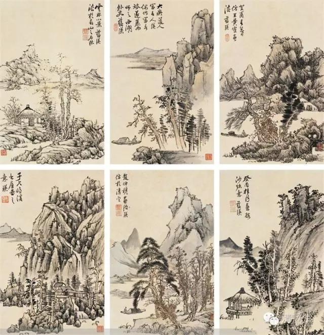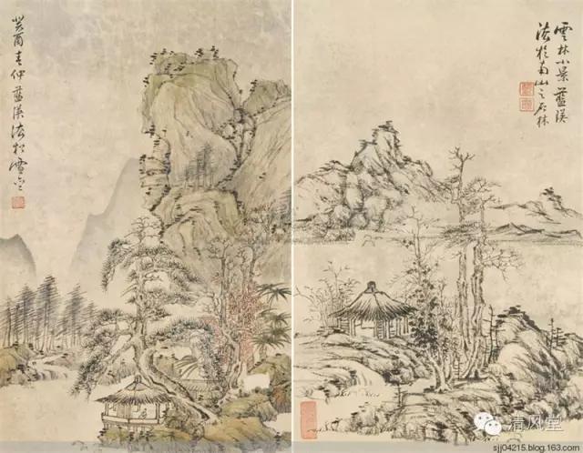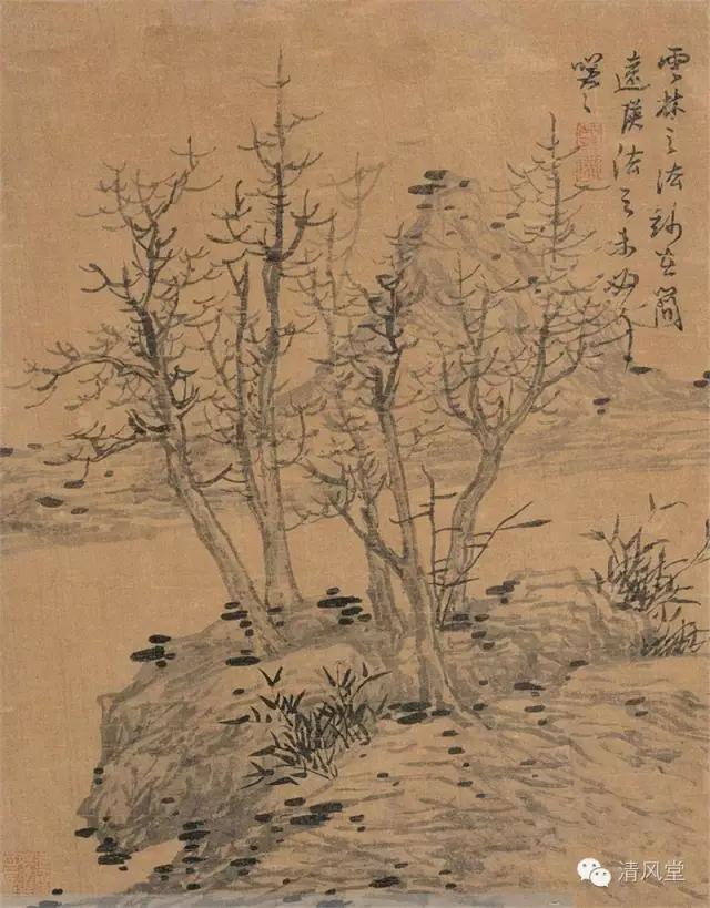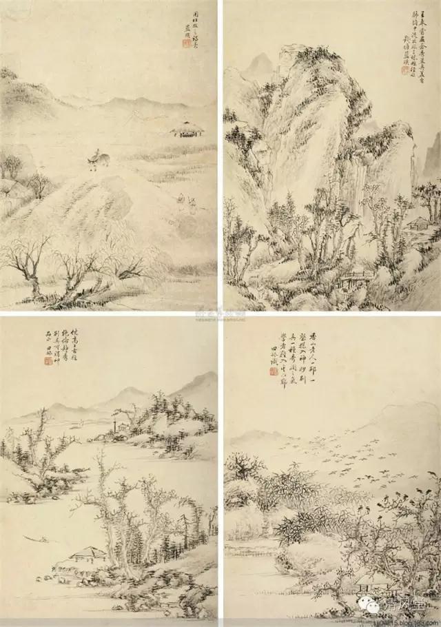 從藍(lán)瑛傳世的作品看,他的山水畫創(chuàng)作大致可分為早、中、晚三個時期。早期為其五十歲以前。從現(xiàn)存藍(lán)瑛早期的繪畫作品中可以看出,他在臨習(xí)古人繪畫作品的過程中,打下了扎實(shí)的筆墨功底。在藝術(shù)成就的取得上,他主要得益于黃公望、王蒙、倪瓚、吳鎮(zhèn)的助力。元四家的筆墨雖不盡相同,但藍(lán)瑛在學(xué)習(xí)他們的繪畫技法時卻能擇良而取,并注意吸取對自己有用的東西,藉以豐富個人的表現(xiàn)能力。