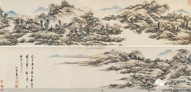 構(gòu)圖上也基本形成了一種統(tǒng)一的樣式:巍峨雄偉的山體以棱角分明的幾何體組成并繁復(fù)堆積,占據(jù)畫面的大部分且多偏向一側(cè),而于另一側(cè)留出一定的空間,山頂突出。山間有飛瀑叢樹,山腳以漁樵隱士、老樹茅屋點(diǎn)綴。同時出現(xiàn)了山體的立軸畫中縱向拉長,在手卷中則橫向延伸的變形現(xiàn)象。晚年的作品中沒有了早期所保留的一定的空間感,代之以一種逼人的氣勢,無論是仿荊浩、董源還是仿黃公望,在風(fēng)格和筆墨上已經(jīng)沒有了差別,它們都已化為藍(lán)瑛的典型山水樣式。藍(lán)瑛晚年的作品,筆益精良,構(gòu)圖高嶂巨壁,丘壑深遠(yuǎn),重山疊翠,更加蒼渾古樸。