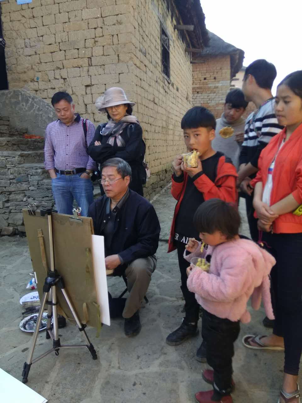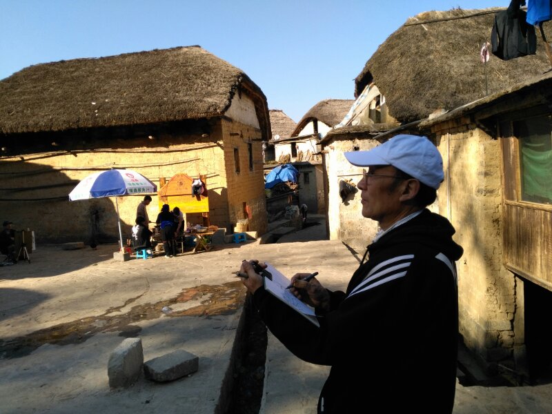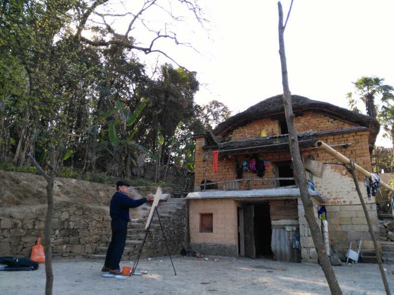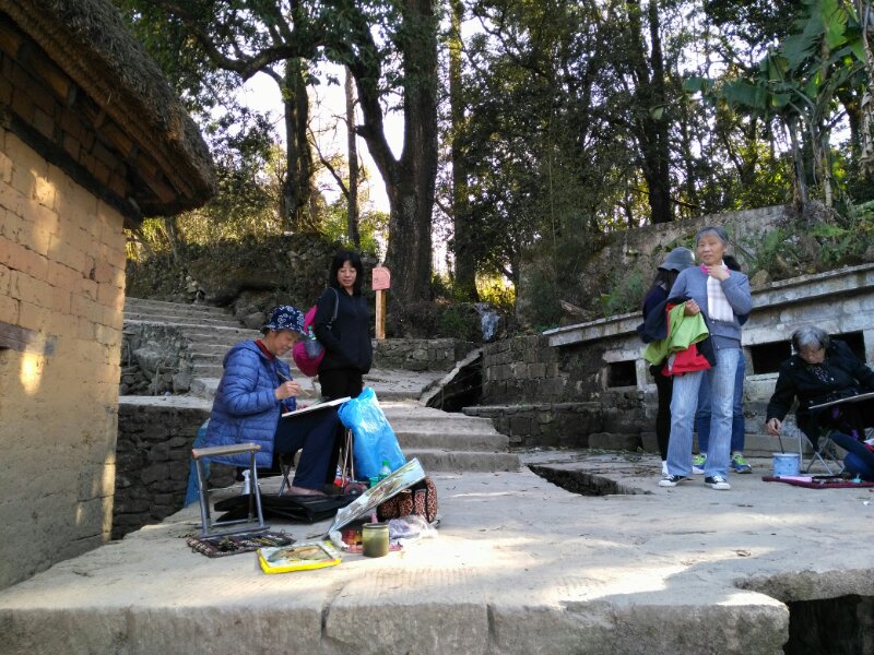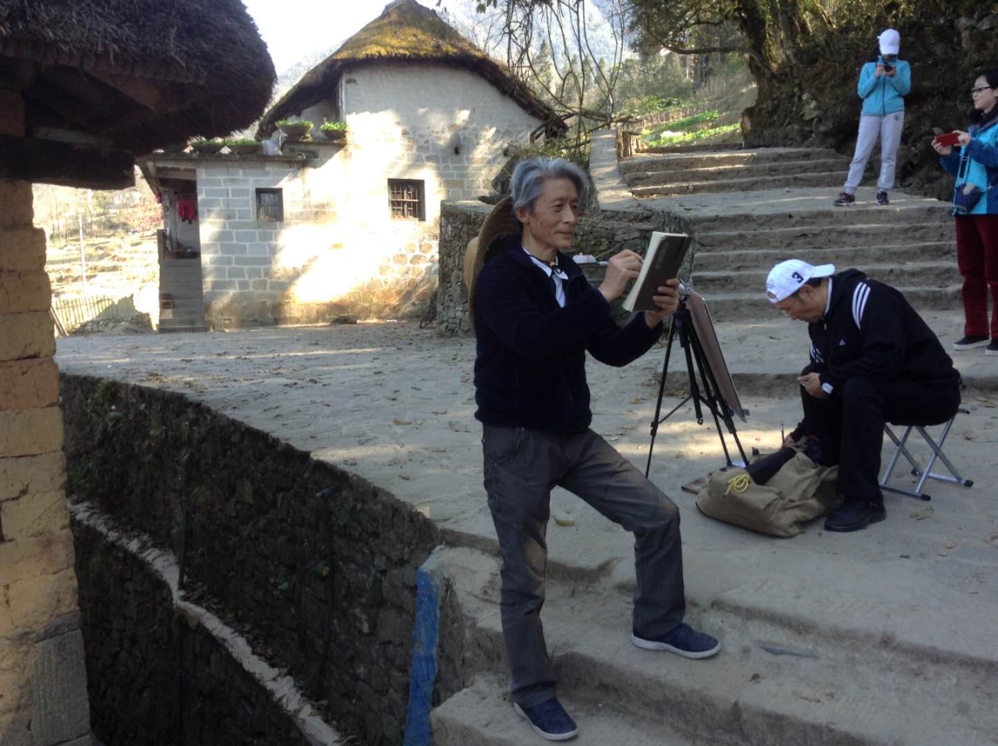 原來準備第二天上午去阿者科村蘑菇房寫生的,由于明天要下雨,時間臨時調整了。決定中午先回賓館吃午飯(按原計劃讓賓館把午飯送到梯田的寫生點),下午兩點出發去蘑菇房寫生,由于旅游旺季交通情況和路況不太熟悉,我們臨時請了當地的導游。盡管已經是下午了,但是路上的車還是非常的多,特別是過多依樹景區車子前行非常艱難,經常停下來等候,但老師們心情還是非常愉快的,還用相機記錄下來沿路的風景。十幾公里的路大巴開了近一個小時,車子停靠在阿者科村進口的大路邊,導游帶著我們沿著小路徒步二十分鐘左右,我們來到村口,當看到芭蕉林、古樹下哈尼族古村落和蘑菇房群時,大家心情有點激動。