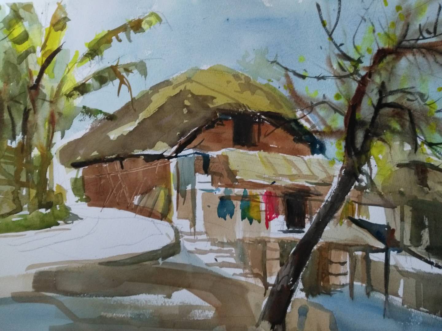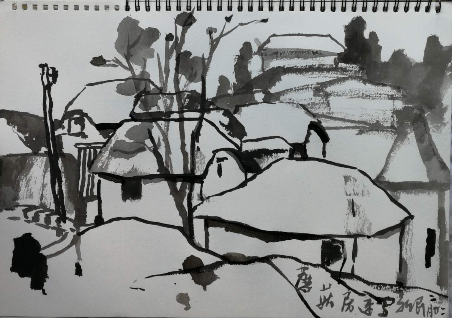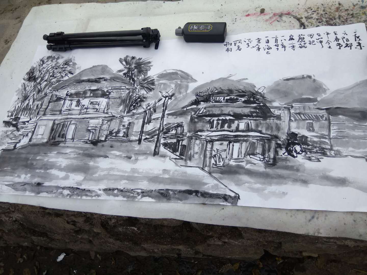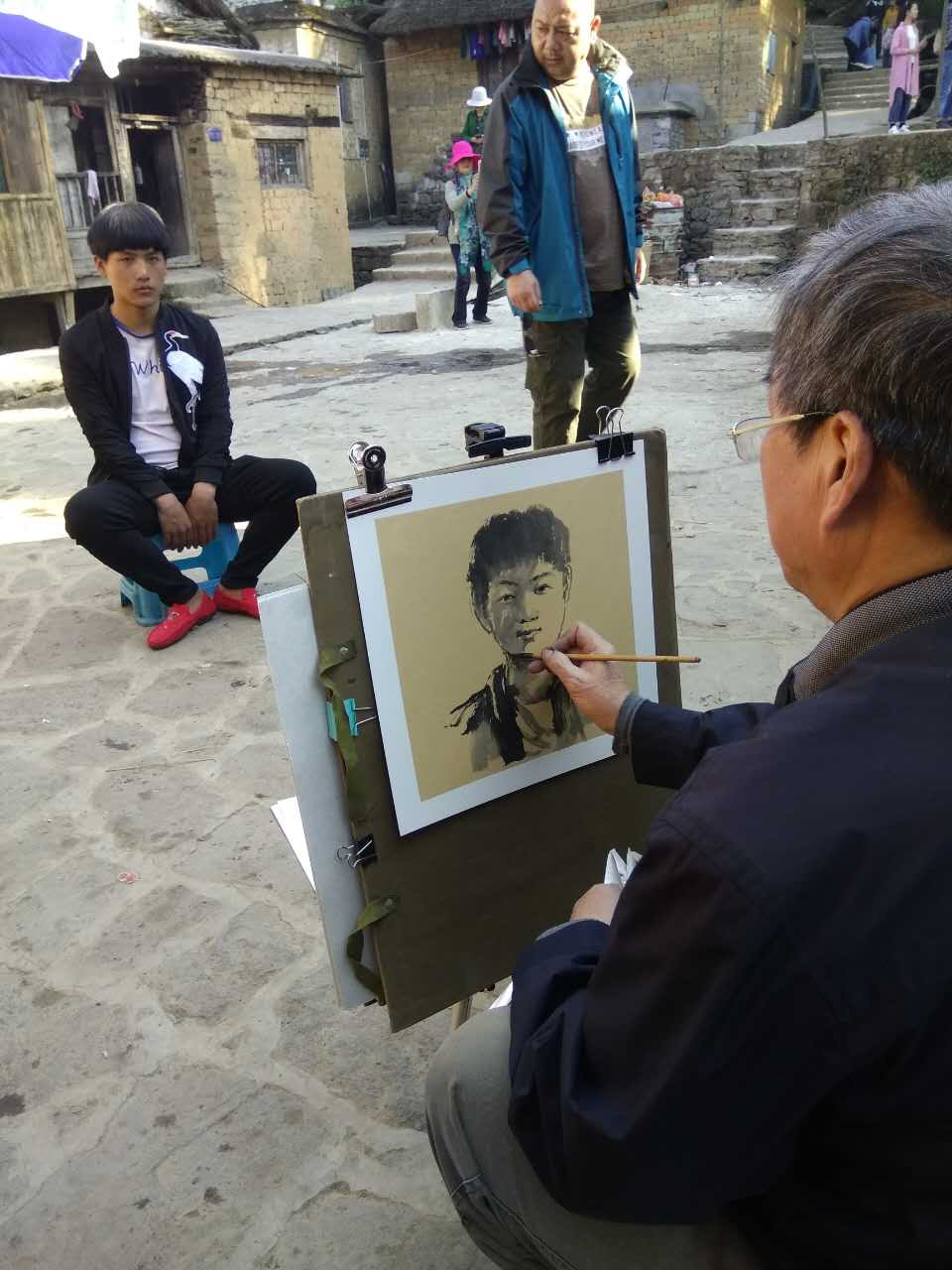 原來準備第二天上午去阿者科村蘑菇房寫生的,由于明天要下雨,時間臨時調整了。決定中午先回賓館吃午飯(按原計劃讓賓館把午飯送到梯田的寫生點),下午兩點出發去蘑菇房寫生,由于旅游旺季交通情況和路況不太熟悉,我們臨時請了當地的導游。盡管已經是下午了,但是路上的車還是非常的多,特別是過多依樹景區車子前行非常艱難,經常停下來等候,但老師們心情還是非常愉快的,還用相機記錄下來沿路的風景。十幾公里的路大巴開了近一個小時,車子停靠在阿者科村進口的大路邊,導游帶著我們沿著小路徒步二十分鐘左右,我們來到村口,當看到芭蕉林、古樹下哈尼族古村落和蘑菇房群時,大家心情有點激動。