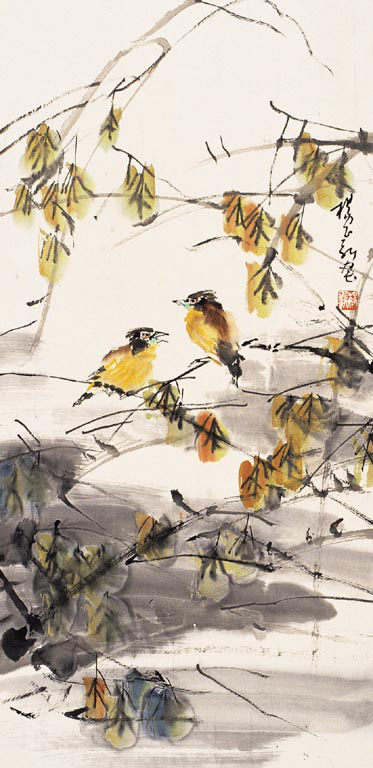 從90年代中期開始,楊正新的水墨畫又有了新的變化。同樣是花鳥、山水,楊正新的花鳥、山水作品除了有筆有墨,有文人情趣、自然氣息,它們還具有一種迥異于以往的新氣象。例如他的花鳥畫創作上,很多墨筆看上去生澀纖弱有點神經質,但墨跡、墨塊卻顯得淋漓酣暢,充滿流動、氤氳之氣,兩相結合,令其畫氣質清麗,充滿風致。而他畫面的色彩與構圖和傳統海派寫意畫相比也有所不同,色彩與色彩、色彩與墨之間往往呈鮮明的對比關系,墨、彩輝映顯得非常響亮,很有現代感。構圖方面,他似乎對表現具體物象的形態并不十分感興趣,他更注重于點、線、面在畫中的平衡與趣味性,更著意于形式的表現了。
