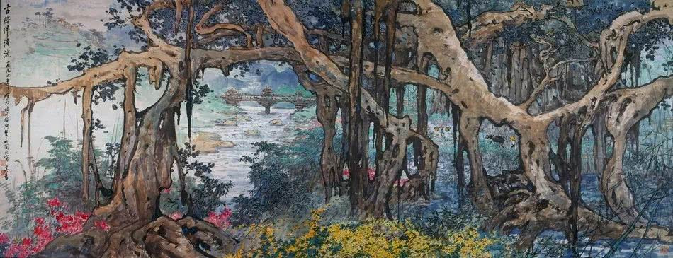 古榕伴清流 140.5X 363cm 紙本設(shè)色
