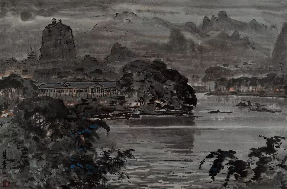 之上這幅作品,山城之夜于1942年在重慶舉辦的“重慶夜景”山水畫展展出,獨(dú)創(chuàng)了中國的夜景山水畫,打破了傳統(tǒng)中國畫不能表現(xiàn)光感的限制,徐悲鴻親自主持了畫展開幕式,并著文說道:“宗其香用貴州土紙,用中國畫筆墨作重慶夜景燈光明滅,樓閣參差,山勢(shì)崎嶇與街頭雜景,皆出以極簡單之筆墨。昔之言筆墨者,多言之無物,今泉君之筆墨管含無數(shù)物象光景,突破古人的表現(xiàn)方法,此為中國畫的一大創(chuàng)舉,應(yīng)大書特書者也!