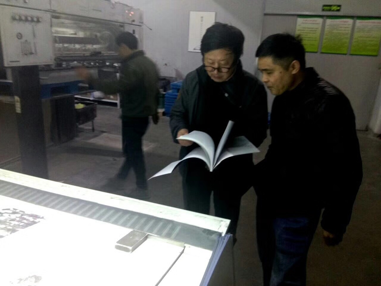 期間余石老師多次在巢培與設計師商討,研究設計效果,并且制作畫冊當天余石老師還與余仁杰老師一同到工廠進行看樣敲定印刷色調。