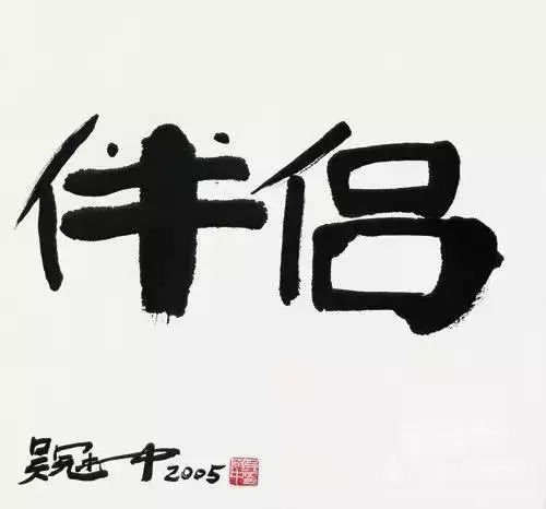 他寫過伴侶二字,凸出了兩個人,兩個口,兩道橫臥的線,兩個點,濃墨粗筆觸間兩個小小的點分外引人這是窺視人生的眼,正逼視觀眾,直刺觀眾的心魄。