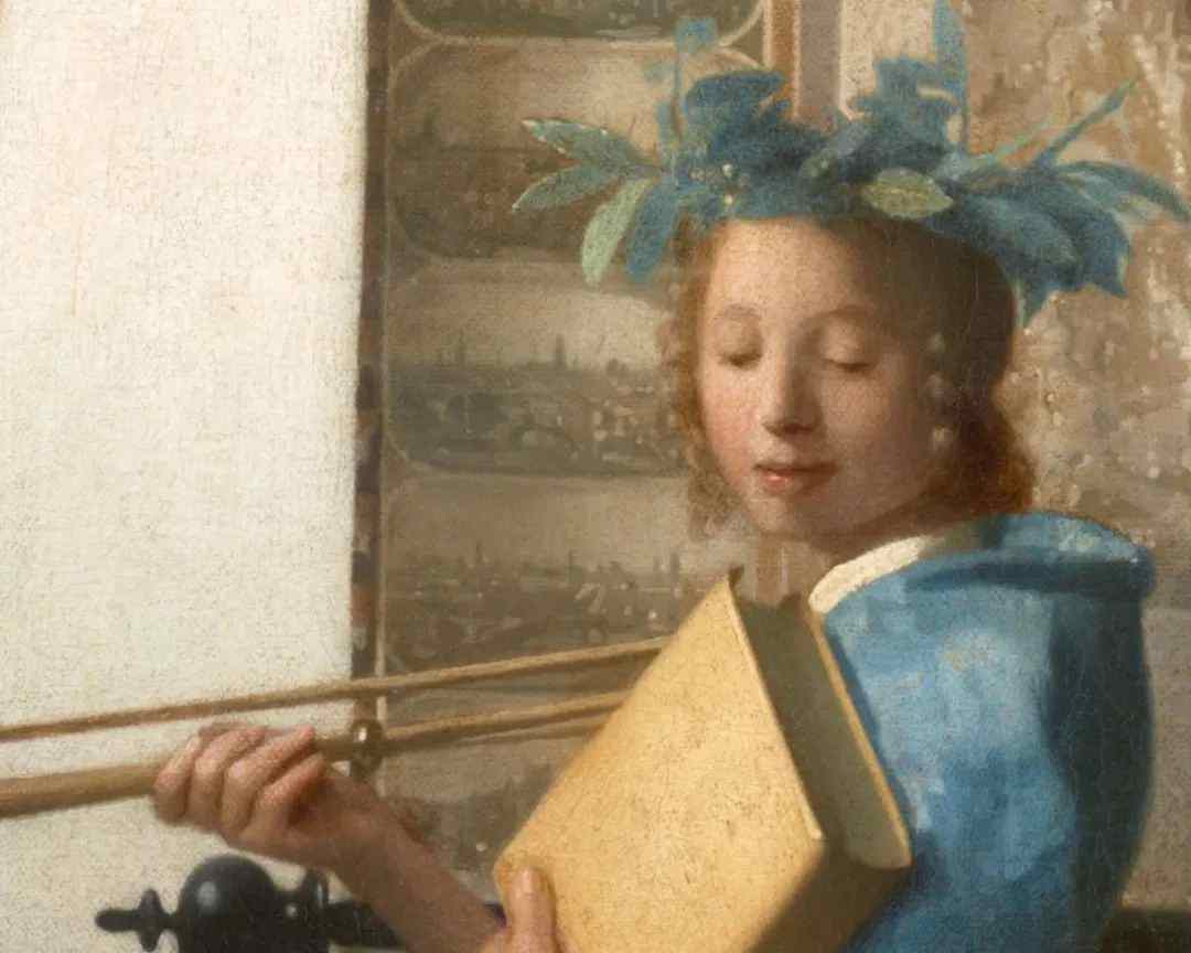 維米爾每一幅作品都有長長的準備期,在這段時間里,各種跡象可以看出來,他在思考如何賦予日常生活場景以象征意義,而且慣于用隱晦手法達到目的,比如背景中的畫,或是用某些難以發現的細節。但在《繪畫的藝術》中,主題本身就是對繪畫的象征。模特代表名聲,她的形象將要在展現在藝術家畫架上的畫布中。藝術家已經開始畫模特頭上的月桂頭冠。