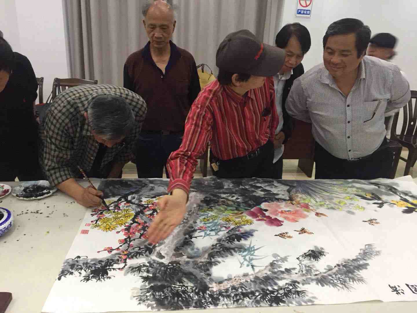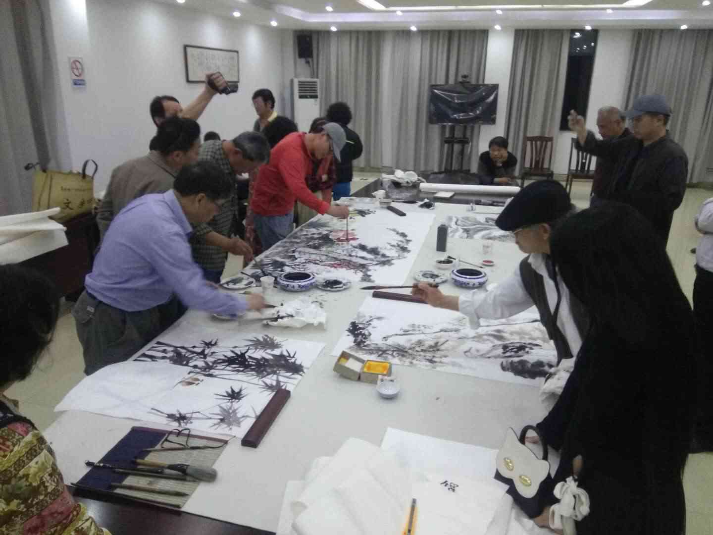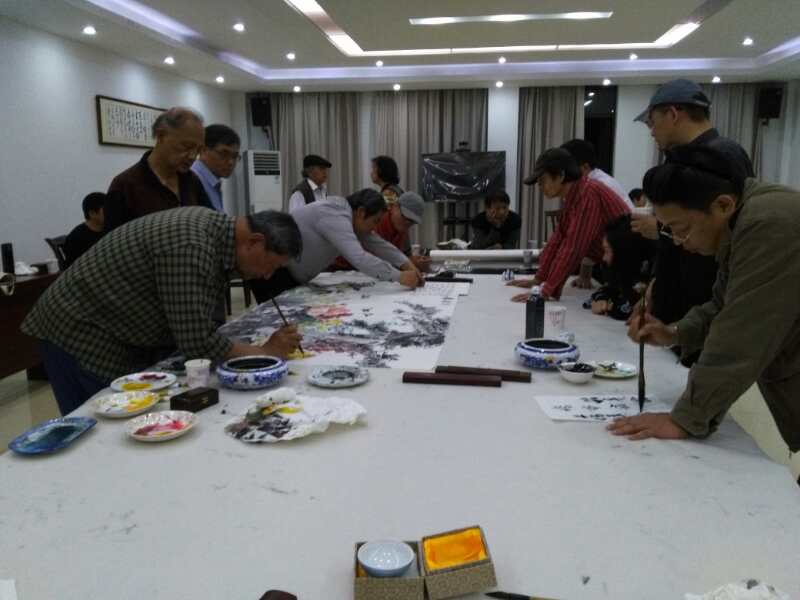 29日晚上,鎮(zhèn)政府宴請了上海的藝術(shù)家們,在武國強(qiáng)老師的要求下,史新民老師提前做好了集體創(chuàng)作一幅大畫的構(gòu)圖和準(zhǔn)備工作,根據(jù)每個(gè)畫家的特長,預(yù)先做了安排,在創(chuàng)作的時(shí)候以史新民老師主筆,武國強(qiáng)老師現(xiàn)場指導(dǎo)。