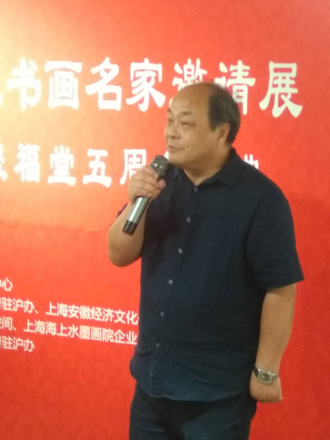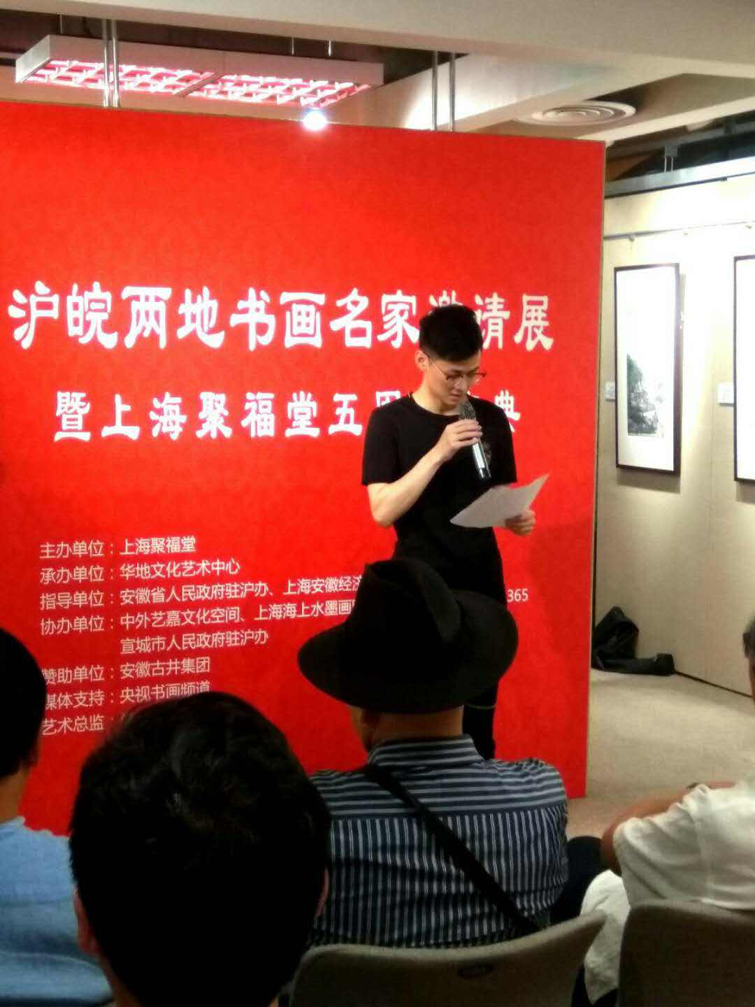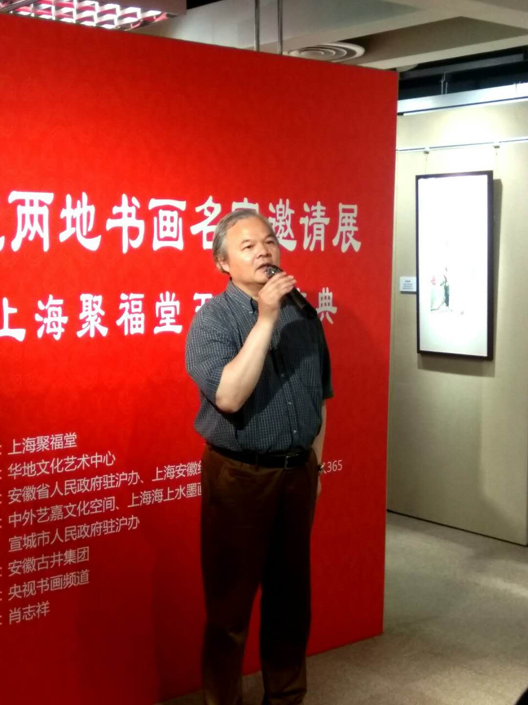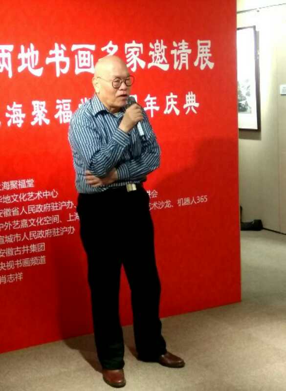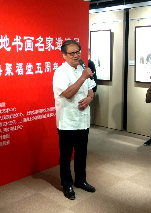 今天下午三點(diǎn)半在上海文化一條街福州路380號(hào)“聚福堂”三樓畫廊開幕。在開幕式現(xiàn)場(chǎng)滬皖兩地名家云集,“聚福堂”董事長肖新林先生跟我說:今天特別的高興,今天是“聚福堂”開業(yè)五周年慶典。