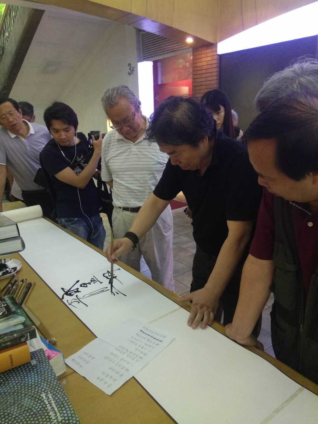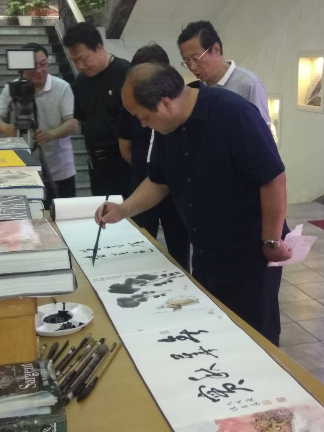 我是下午兩點(diǎn)半到“聚福堂”的,我聽肖老板說:安徽省美協(xié)名譽(yù)主席張松先生,現(xiàn)任主席楊國新先生等還有幾位安徽省美協(xié)副主席已經(jīng)在樓上寫字畫畫了,剛到三點(diǎn),肖老板跟我說:樂震文院長到三樓展廳了,我趕緊從外文書店上了三樓展廳,在展廳的門口從外面到里面已經(jīng)是嘉賓云集了,95歲高齡的老畫家林曦明先生來了,上海美術(shù)家協(xié)會(huì)副主席兼秘書長陳琪先生來了,上海書法家協(xié)會(huì)主席周志高先生來了,軍營老畫家楊列章,上海中國畫院的丁筱芳,還有李俊,孫楊,武國強(qiáng),張偉生,何德銘,李新衛(wèi),葛幸福,姚振裱,俞育銘,杜永平等許許多多藝術(shù)家都來了,還有我熟悉的朵云軒姜總,中央書畫頻道記者格格等媒體,以及安徽省政府在上海辦事處的領(lǐng)導(dǎo),宣城市的領(lǐng)導(dǎo),老朋友宣城市水東鎮(zhèn)的張書記,還有普陀區(qū)書法家協(xié)會(huì)主席湯其耕上下忙碌的接待大家。