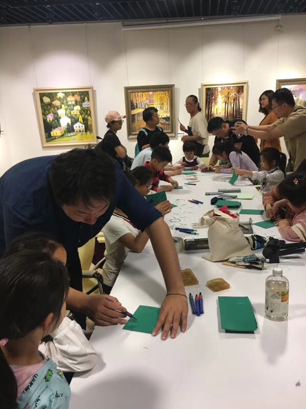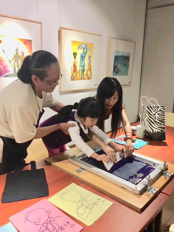畫展現場與愛好美術的小朋友們,做版畫創作的互動