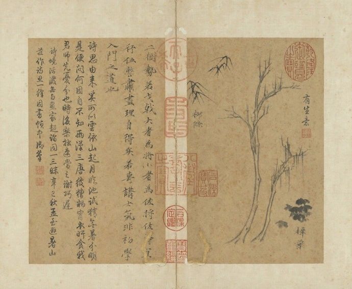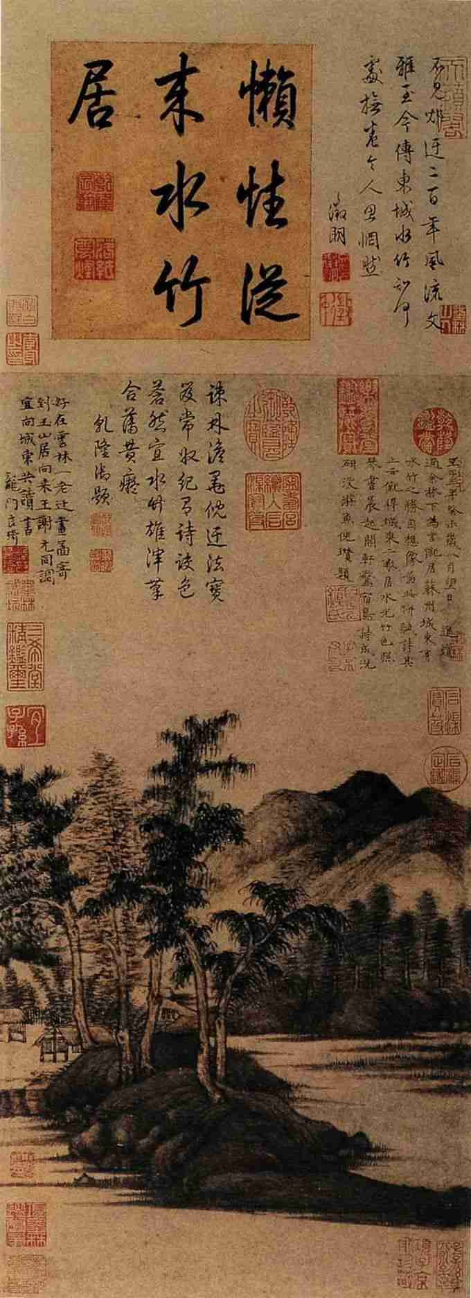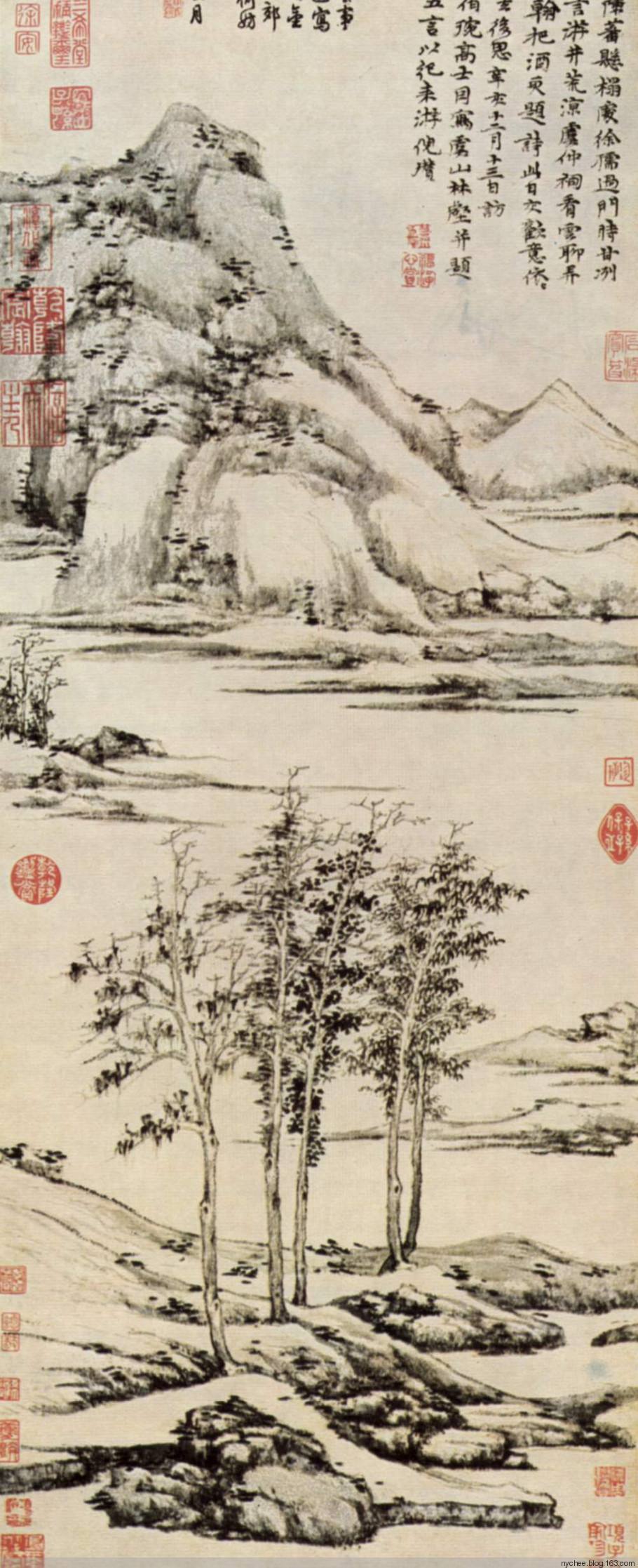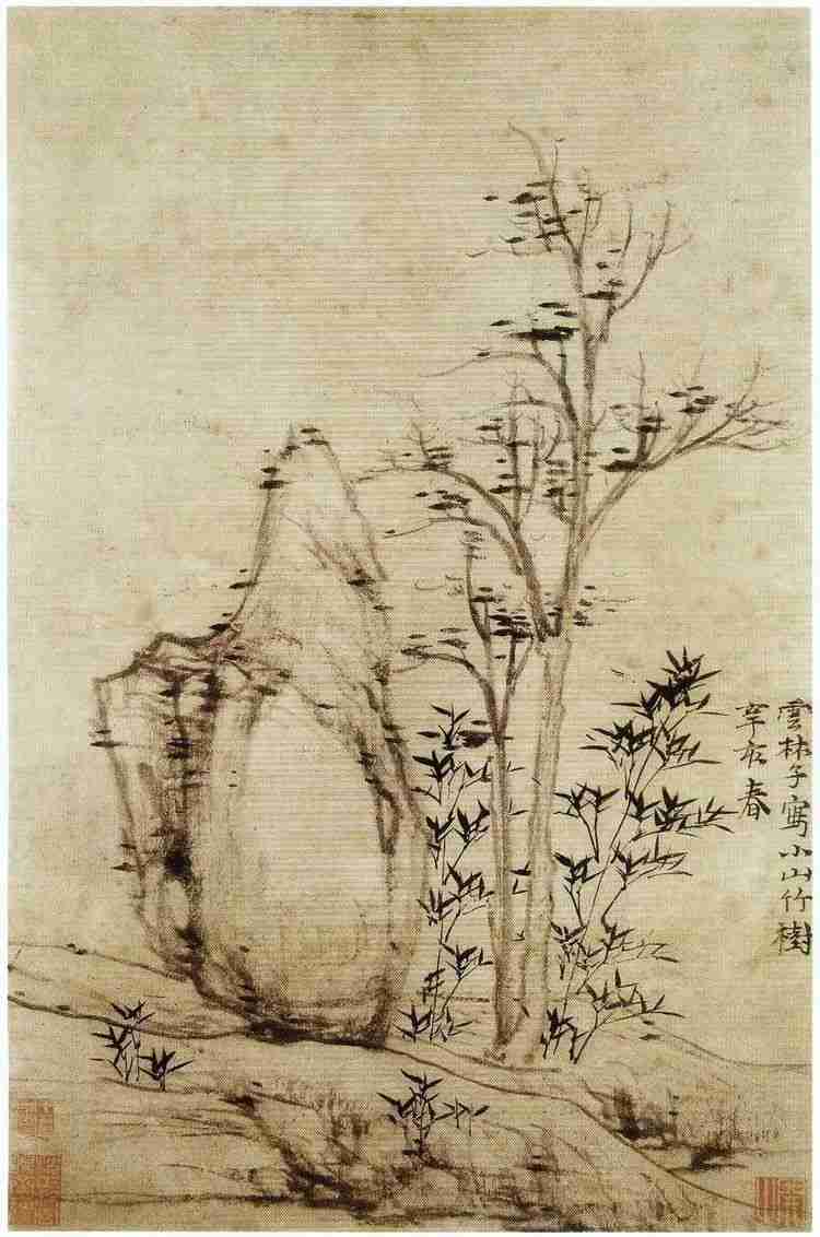 倪瓚擅山水、竹石、枯木等,其中山水畫中采用了典型的技法——折帶皴,是元代南宗山水畫的代表畫家,其作品以紙本水墨為主。其山水師法董源、荊浩、關仝、李成,加以發展,畫法疏簡,格調天真幽淡。作品多畫太湖一帶山水,構圖平遠,景物極簡,多作疏林坡岸,淺水遙岑。用筆變中鋒為側鋒,折帶皴畫山石,枯筆干墨,淡雅松秀,意境荒寒空寂,風格蕭散超逸,簡中寓繁,小中見大,外落寞而內蘊激情。
