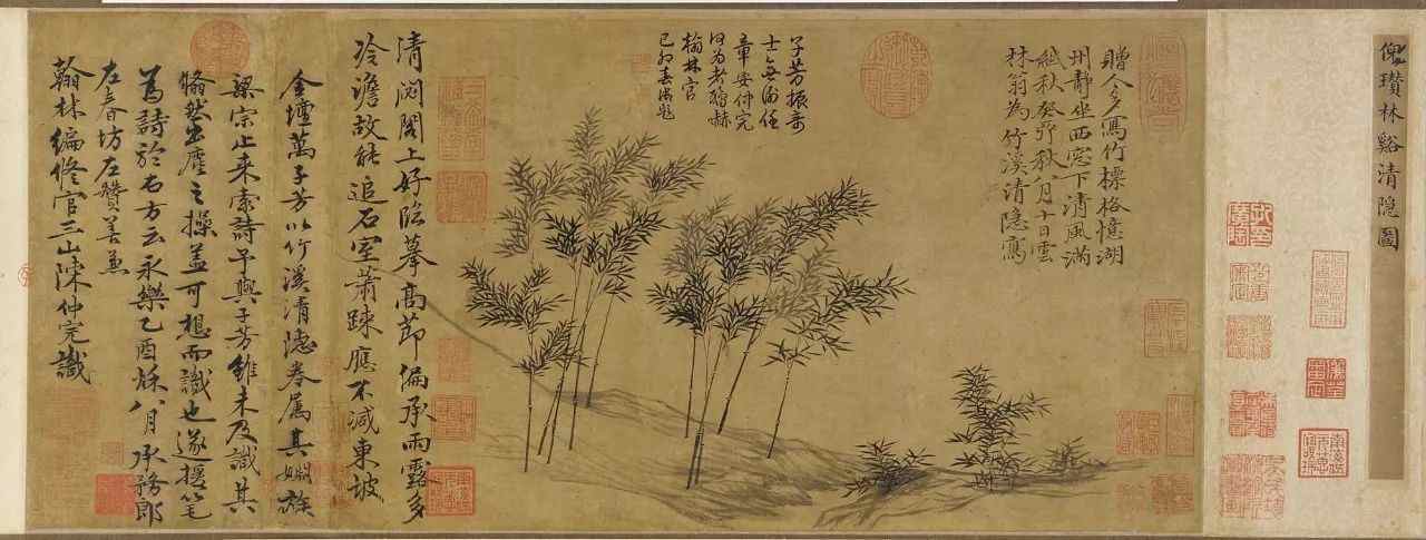 元順帝至正初忽散盡家財,浪跡太湖一帶。倪瓚擅畫山水、墨竹,師法董源,受趙孟頫影響。早年畫風清潤,晚年變法,平淡天真。疏林坡岸,幽秀曠逸,筆簡意遠,惜墨如金。以側鋒干筆作皴,名為“折帶皴”。墨竹偃仰有姿,寥寥數筆,逸氣橫生。書法從隸入,有晉人風度,亦擅詩文。與黃公望、王蒙、吳鎮合稱"元四家"。存世作品有《漁莊秋霽圖》《六君子圖》《容膝齋圖》等。著有《清閟閣集》。