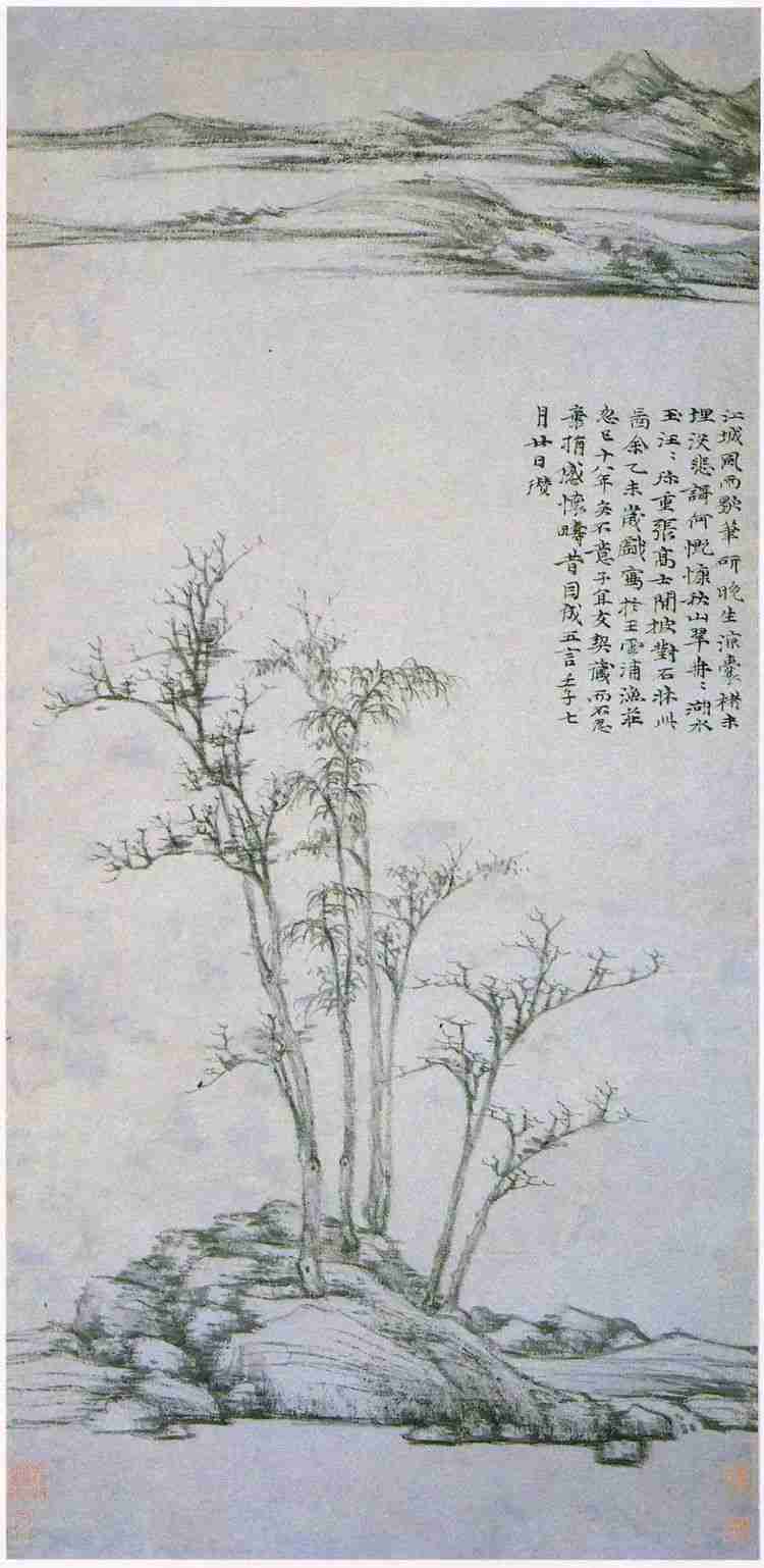 這一階段,倪瓚創作了《松林亭子圖》(1354)、《漁莊秋霽圖》(1355)、《怪石叢篁圖》(1360)、《汀樹遙岑圖》(1363)、《江上秋色圖》(1368)、《虞山林壑圖》(1371)等許多力作給后來的明清繪畫以巨大的影響,成為元四大畫家之一。