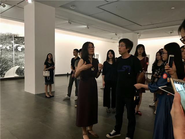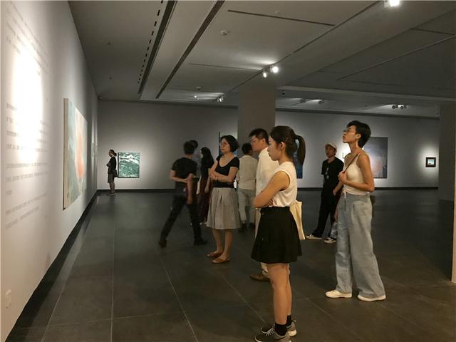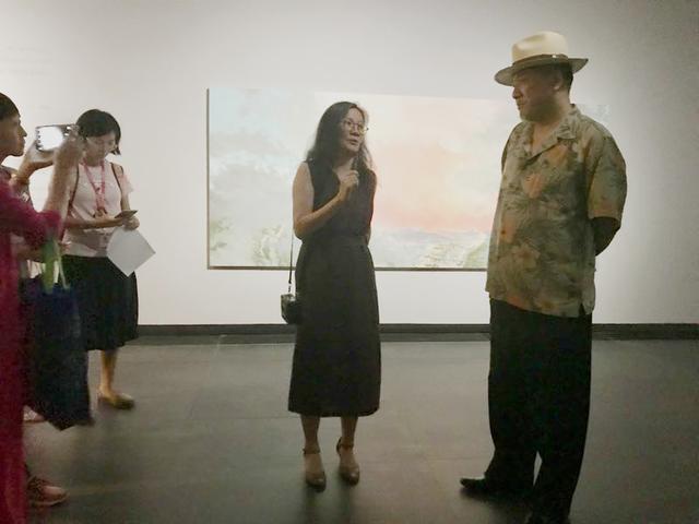 策展人樊林導覽1號展廳,與本次展覽藝術家倪軍(右一)一起介紹作品
