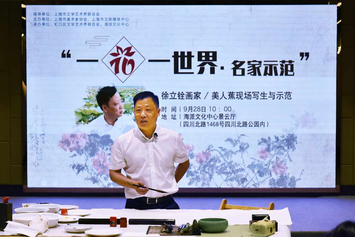 在上海市文學藝術界聯合會指導,上海市文聯媒體中心聯合上海市美術家協會共同推出“一花一世界·名家示范”活動,第六期有著名畫家徐立銓美人蕉寫生示范活動與2018.9.28.上午九點在上海海派文化中心舉行,這次活動有虹口區文聯和上海海派文化中心承辦,上午八點半已經有許多藝術愛好者早早地來到海派文化中心廣場寫生現場,電視直播的工作人員也早早地來到現場調試攝像機。