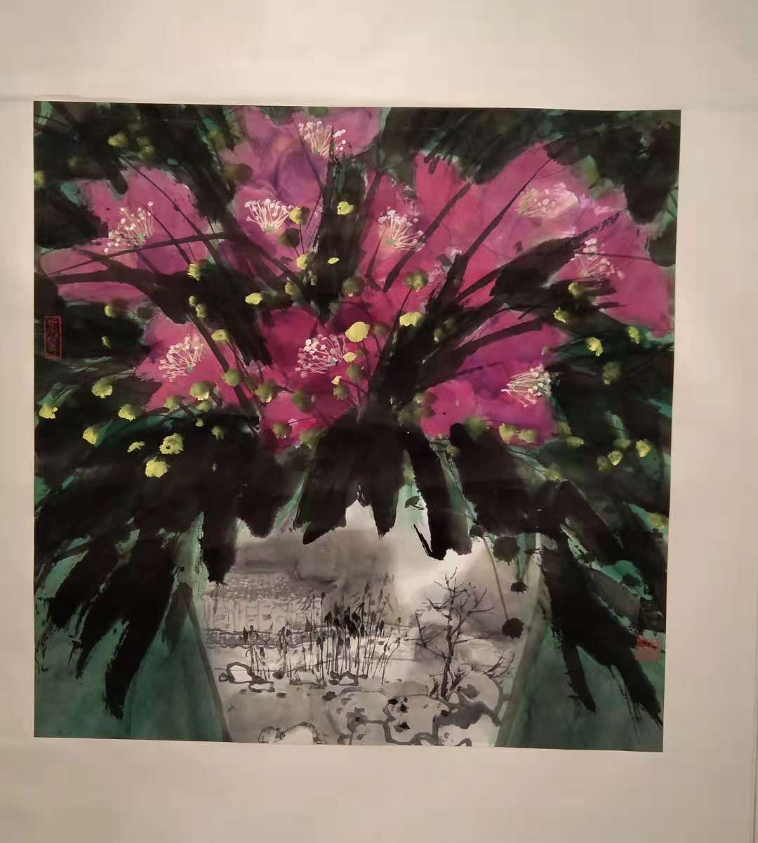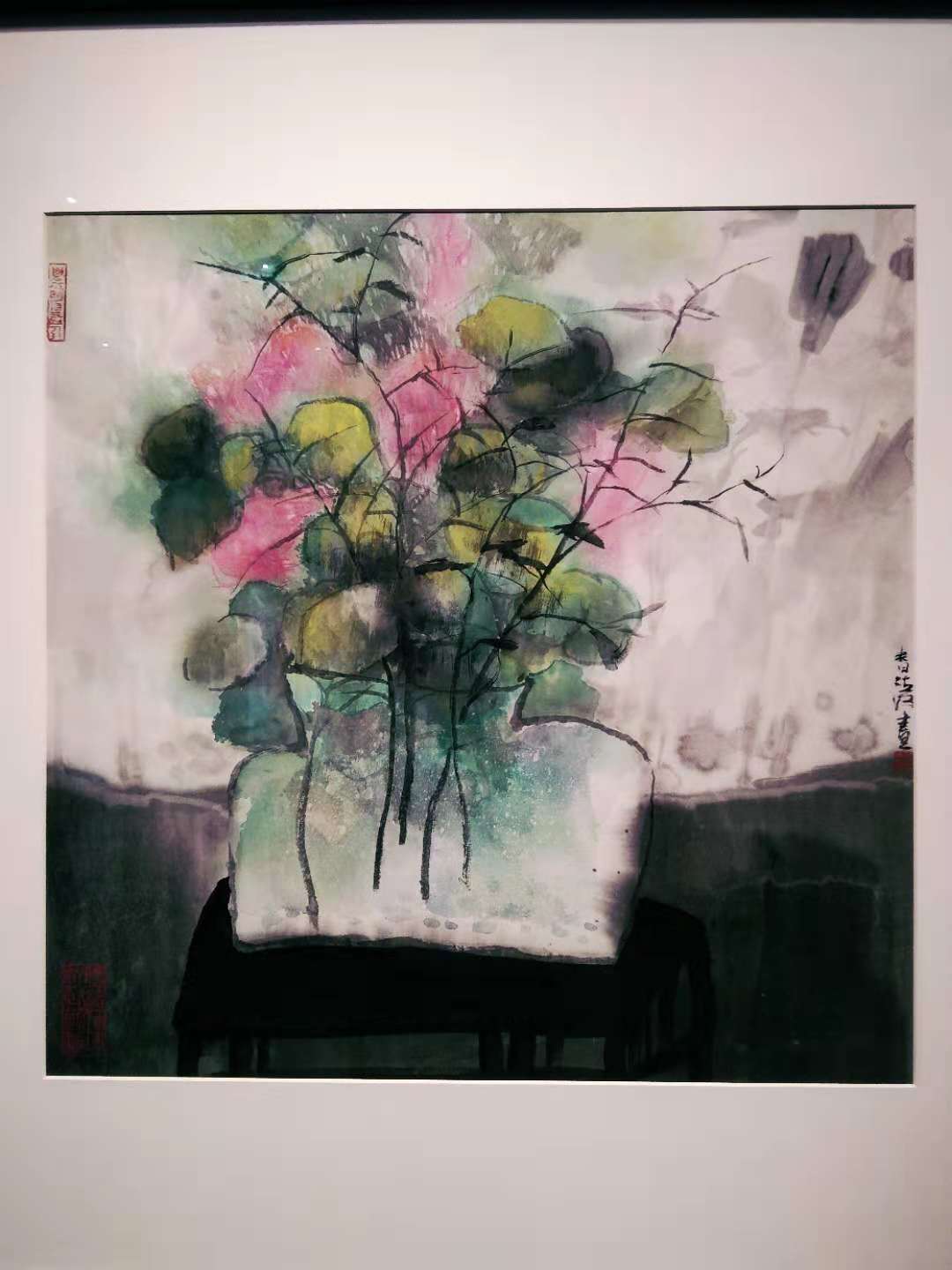 我和陸春濤是大學同學加好友,陸春濤作品觀摩展亮相上海中國畫院已經有一個多星期了,由于上個月的九月二十九日參加崇明新海建鎮十周年慶典,沒有第一時間過來,心里就好像缺了一些什么,今天上午剛剛從農工黨上海市委秘書長辦公室那里出來,就急急忙忙的來到位于岳陽路的中國畫院,走進畫院的美術館,整個色調就是一個藝術殿堂,墻是鐵銹紅色的,迎面看到第一幅作品“舒卷任天真”畫的是瓶花,整個畫面給人一種舒心安詳的感覺,用筆松松的,色彩淡雅的,線和面的結合和塊面的對比又是那么的自然,顯示了春濤早年的中國畫傳統功底。