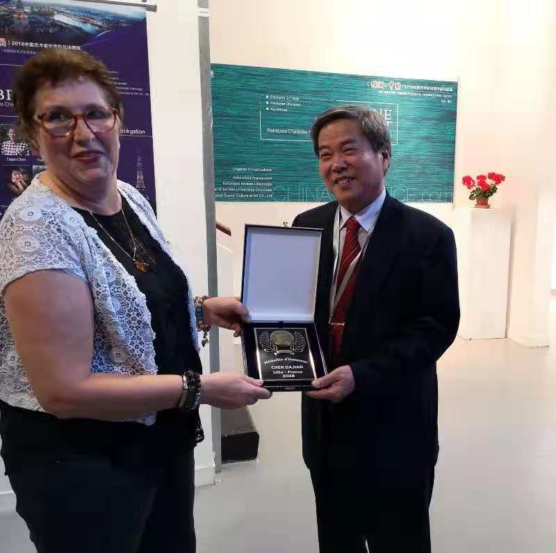 法國(E.A.U)主席芬妮.馬丁女士代表法國里爾政府部門向給陳大健頒發2018年“法蘭西共和國榮譽勛章”