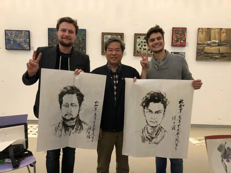 陳大健先生為北加萊國立高等美術學院二位研究生現場水墨人物寫生