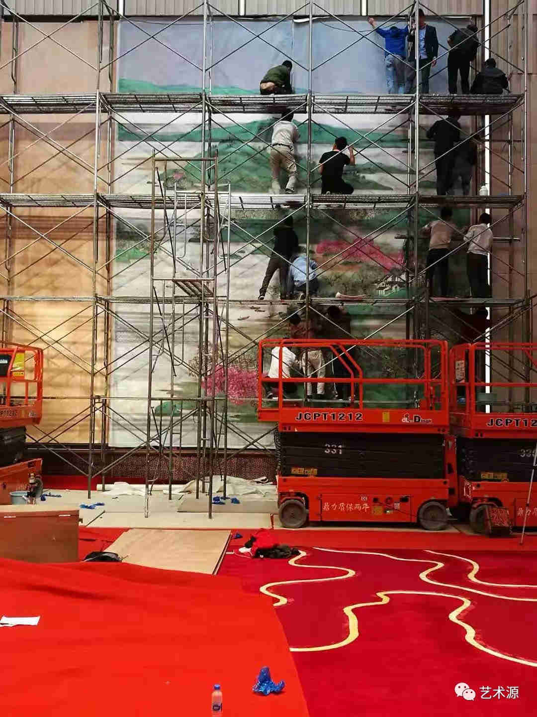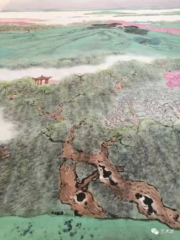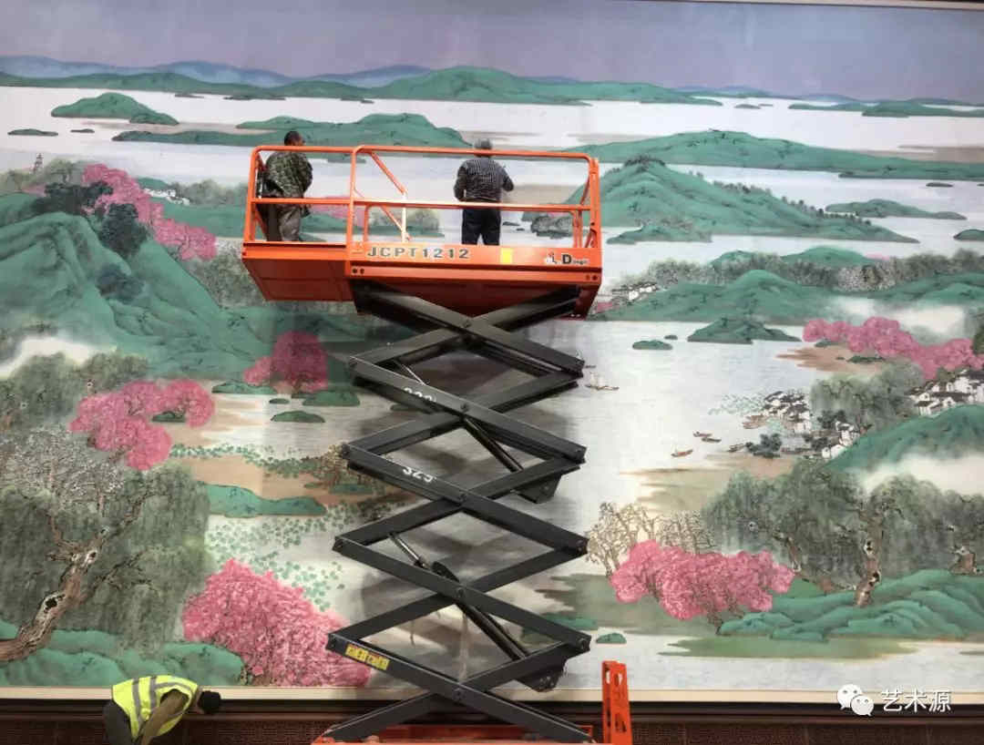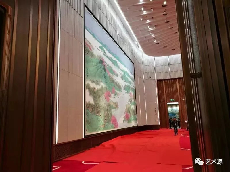 這是目前全國最大的中國畫青綠山水作品,高784cm x 寬1310cm。作品由中國美協理事、上海市美協副主席陳琪、畫家車鵬飛、畫家江宏、畫家汪家芳等4位藝術家合作精心創作。