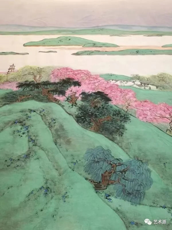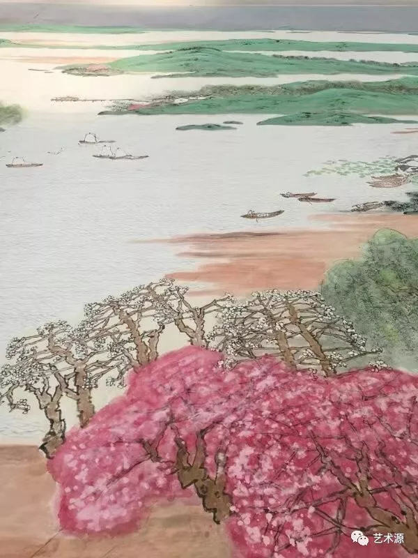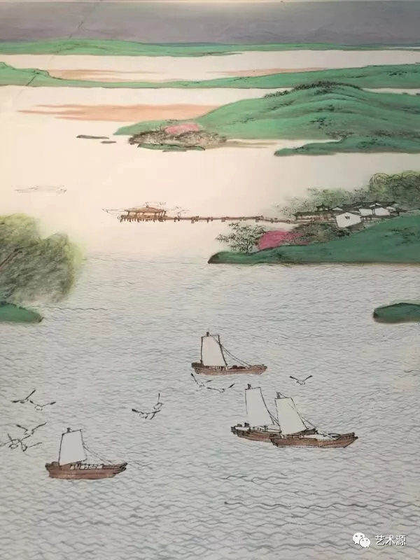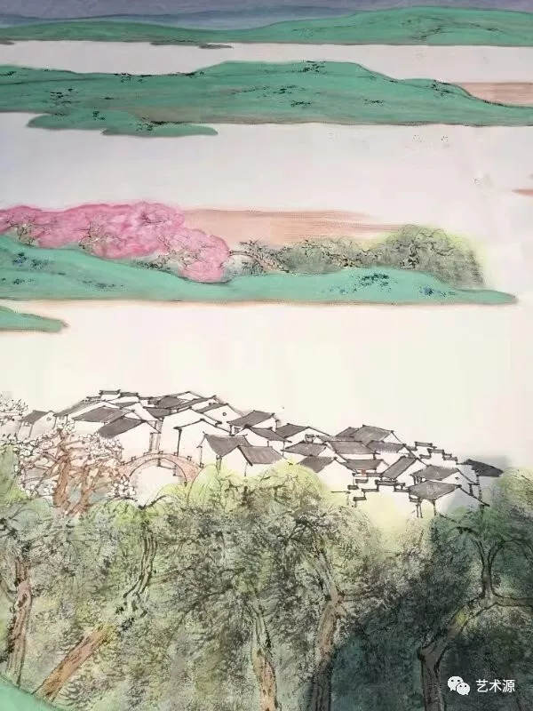 江南的春天當然離不開水的表現,水是畫面中心,也是連接山與水,人與自然的紐帶,創作團隊在水的處理方法上用勾線的方法,與平遠的山勢相呼應,然后層層擦染,表現出水的淸靈讓人身臨其景,有"日出江花紅勝火,春來江水綠如蘭"之感。