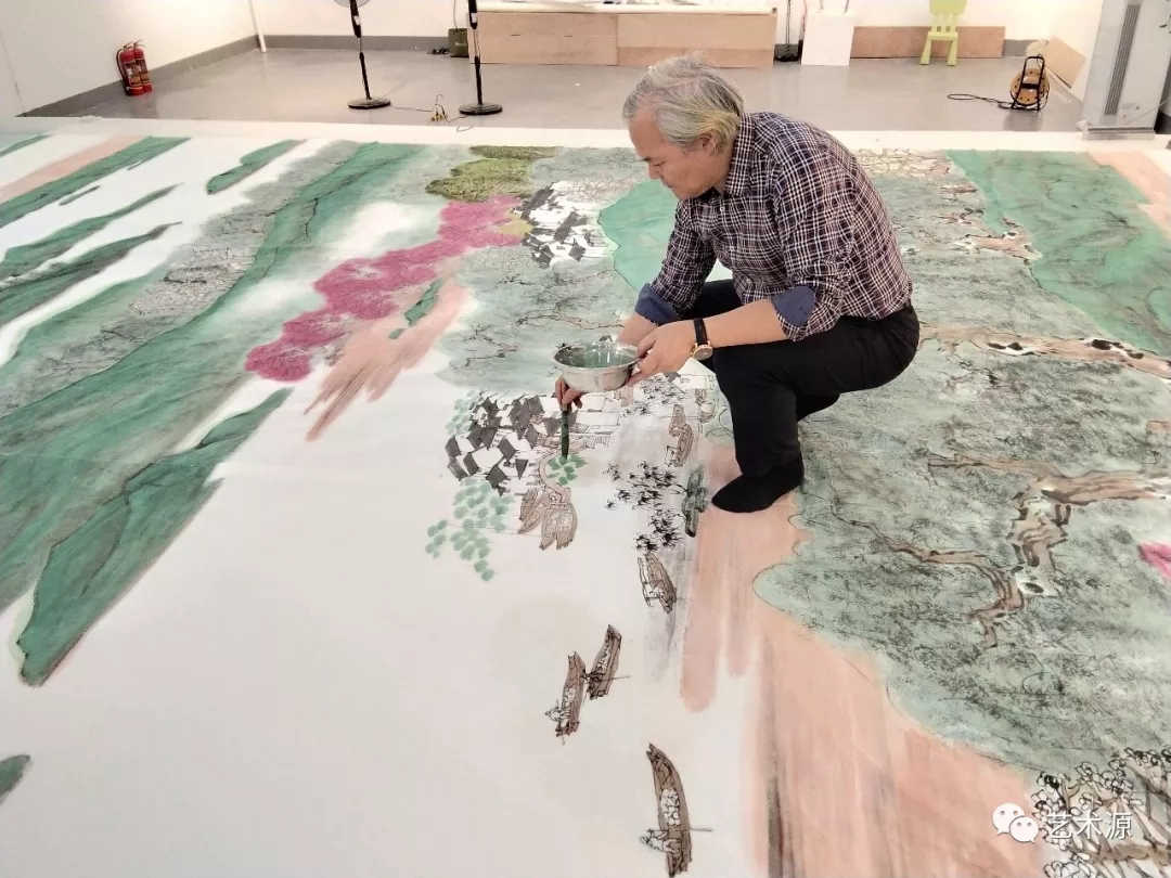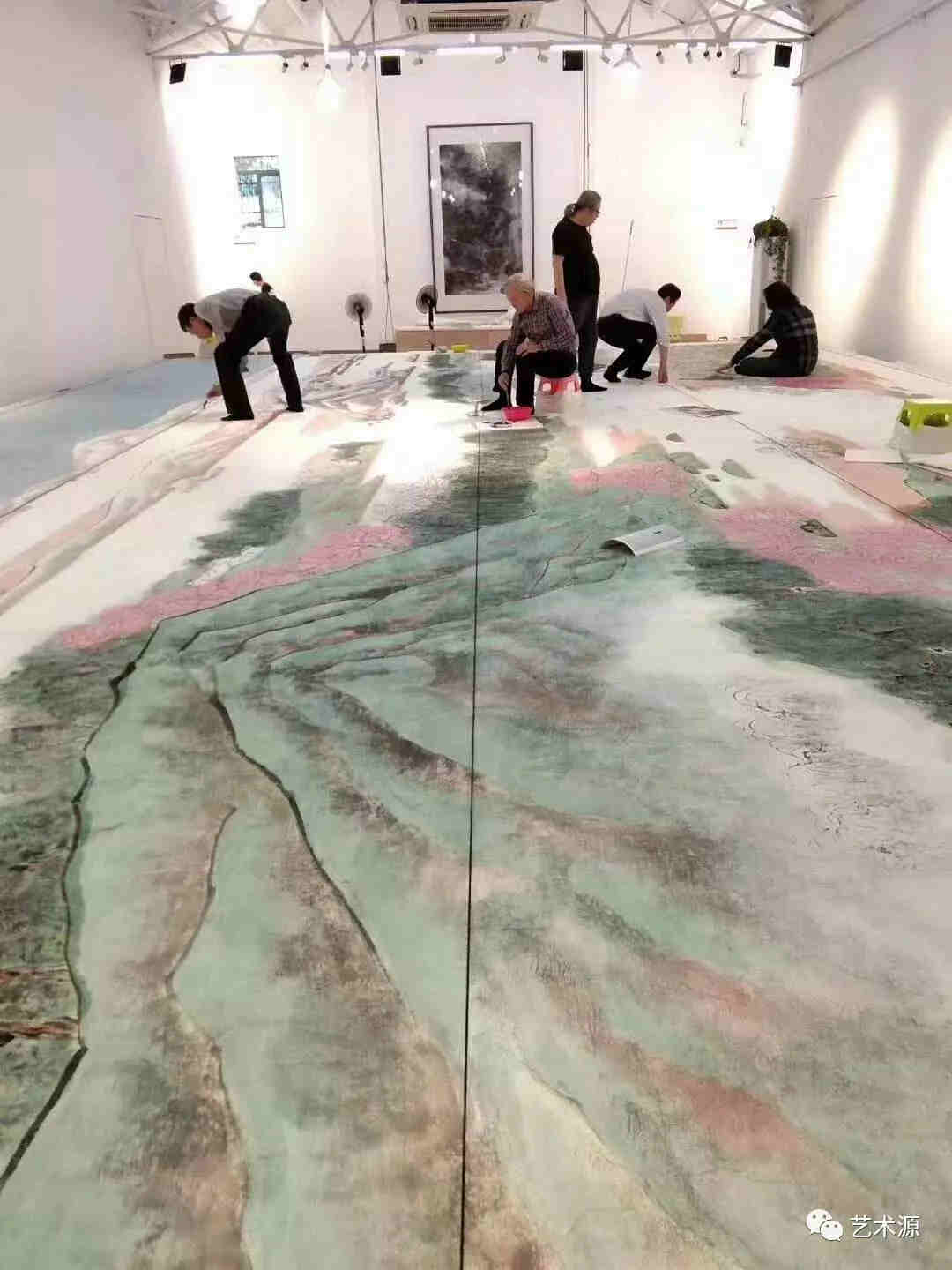 這次創作團隊四人都對江南生活江南文化比較熟悉,陳琪是畫人物花鳥為主,車鵬飛、江宏、汪家芳擅長山水,合作中各自發揮長處和智慧,相互配合,在較短的時間較好完成當代最大的一件青綠江南山水作品。