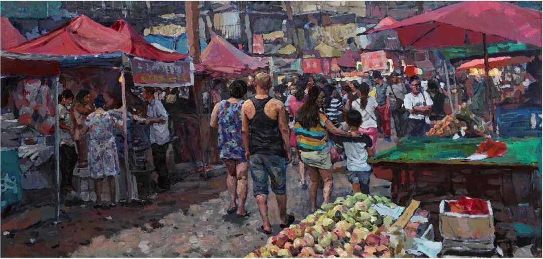 隨著國家美術事業的繁榮發展,近些年來油畫藝術創作也取得了長足發展,本次展覽一定程度上展示了新時代油畫藝術的創作生態,在作品精神品質和語言品質上都給予了足夠的關注。扎根人民、反映時代、貼近生活可謂是展覽的突出特點,表現新時代、新生活進程中人民精神面貌和生活狀態的作品占入選總數的近46%,描繪普通勞動者,頌揚匠人精神成為美術家熱切表達的主題,如《收青稞》《豐收》《窯河采藕人》《明天是小年》《夕陽》《守望者系列11—胡琴匠人》等。此外展現民族文化的《侗家櫥窗—二》《商場》等、紀錄非遺傳承的《隴上曲系列之23》《對話?空間11》等、表現絲路精神的《絲路印象之敦煌》《絲路駝鈴》等、懷念鄉韻故里的《童年記憶》《即將消逝的風景》等對于民族精神、傳承精神和時代精神的表達都體現了展覽的精神品質。