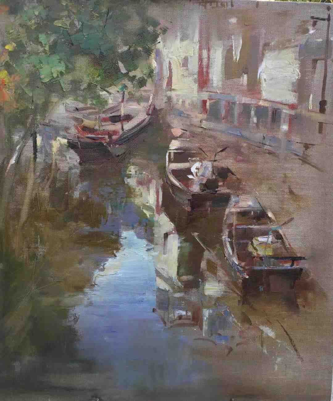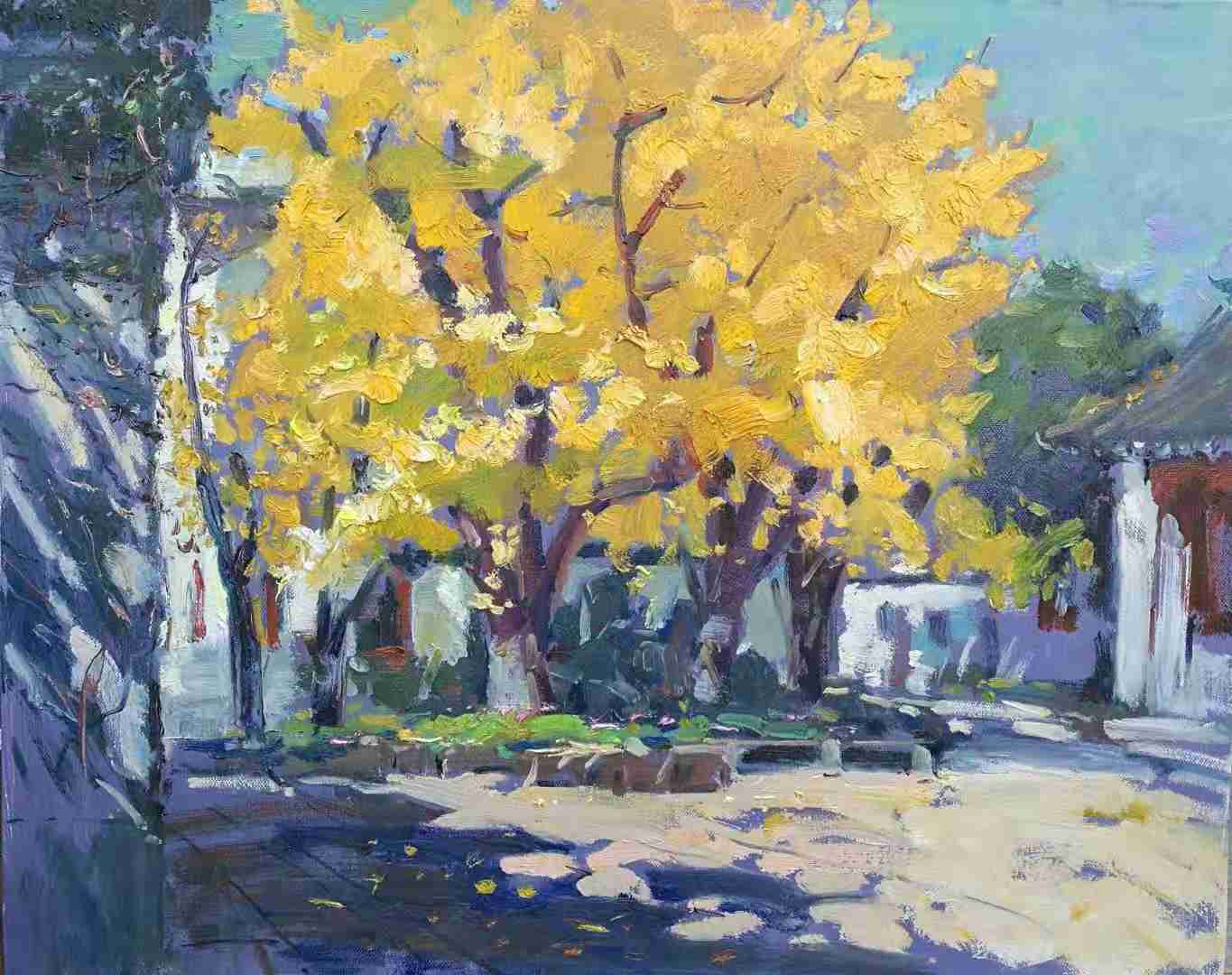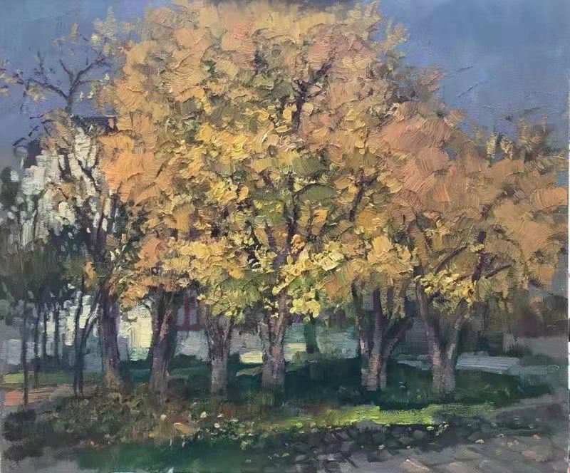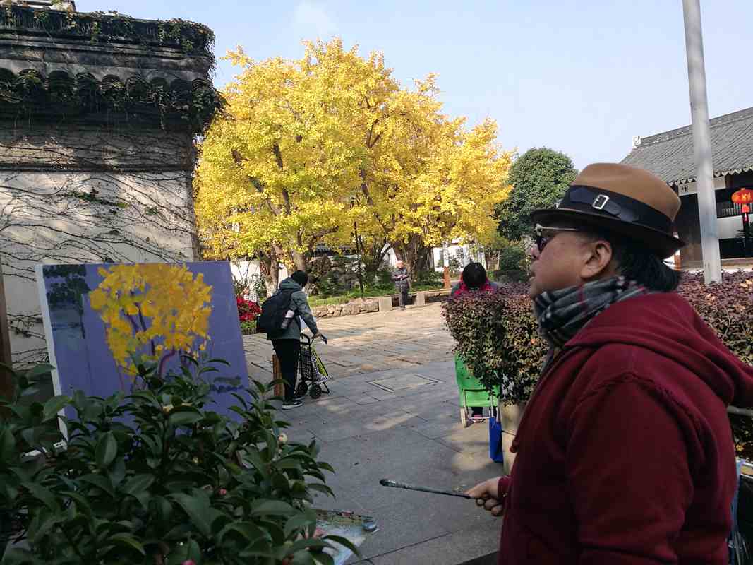 十一月的江南天氣陰陽變化很大,一場雨水洗凈了山山水水,層林盡染、漫江碧透,蘇州東山的銀杏樹一下子換裝了,黃色的、金色的,還透一點綠,色彩斑斕,是油畫家們寫生的好時季。