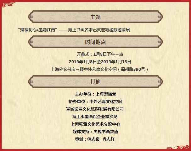 “聚福初心·墨韻江南”——海上書畫名家己亥迎新楹聯邀請展,即將于2019年元月8日下午三點半在上海福州路390號外文書店三樓中外藝嘉文化空間拉開帷幕,這是上海聚福堂每年一度的楹聯邀請展。