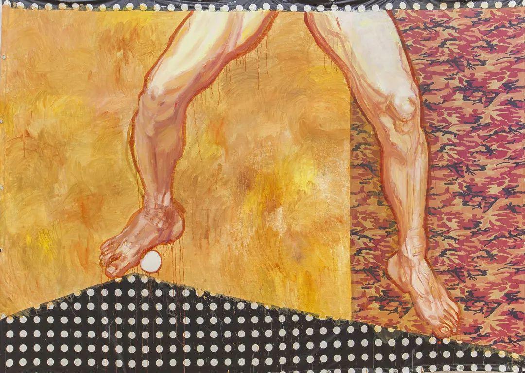 金陽平,睬著一個按摩球的腿,布面油畫,230×310cm,2017