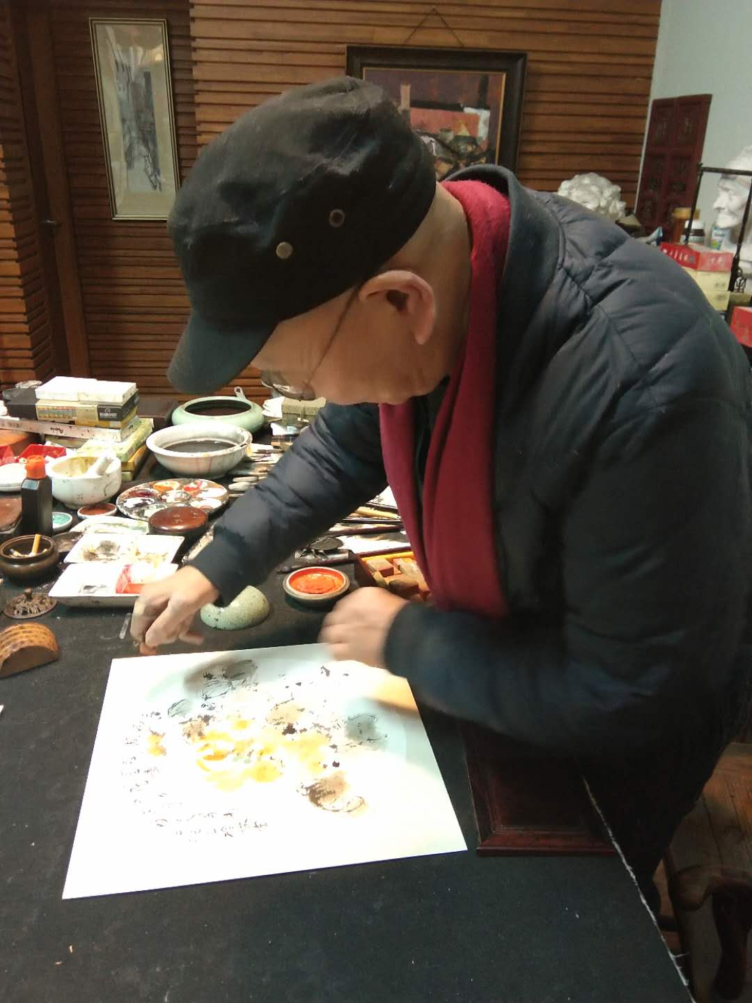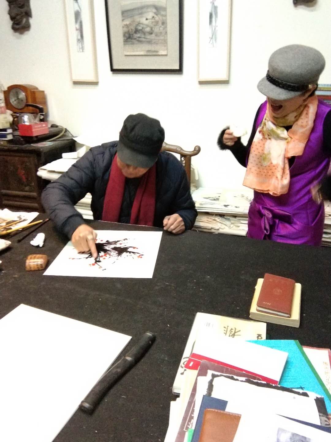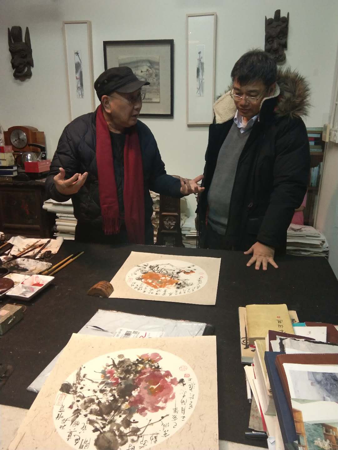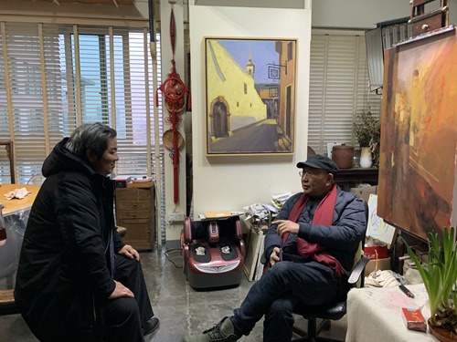 二月十四日下午,我和黃阿忠老師約好下午三點半去阿忠老師的畫室,阿忠老師家已經高朋滿座,到老師畫室最開心的事,就是看老師的繪畫作品,老師的油畫和國畫樣樣精通,散文和詩賦可以說是上海灘的全才,我來到畫室自然就談到繪畫,他分析了我最近一段時間的寫生和創作的作品,又毫不保留的示范和解說,讓在場的人得益匪淺。