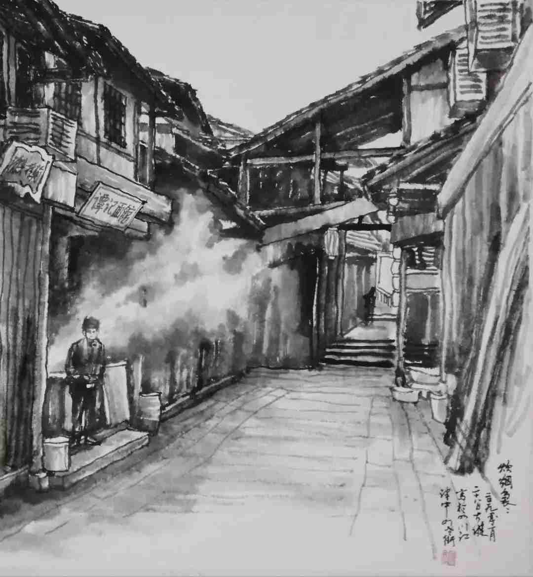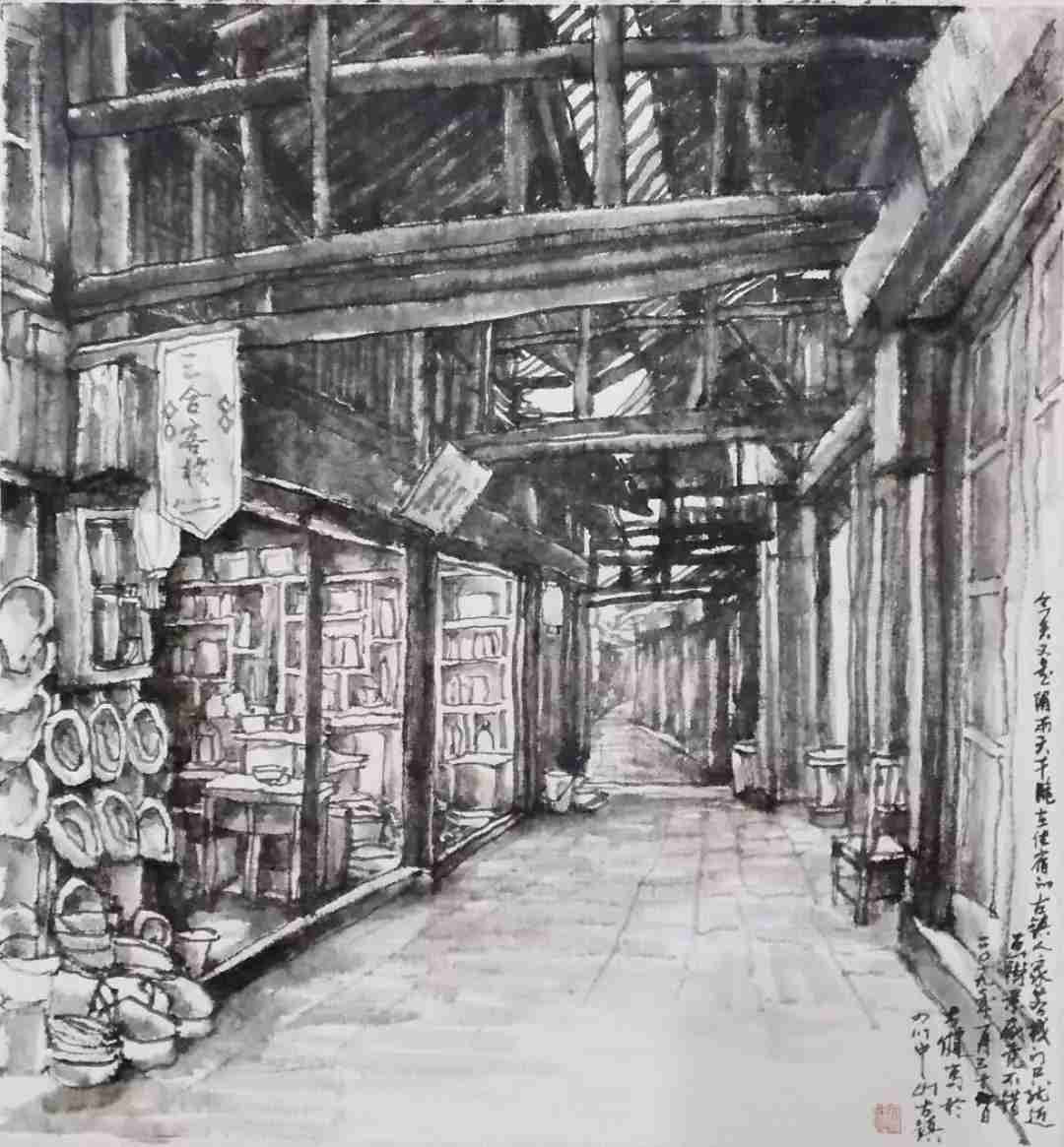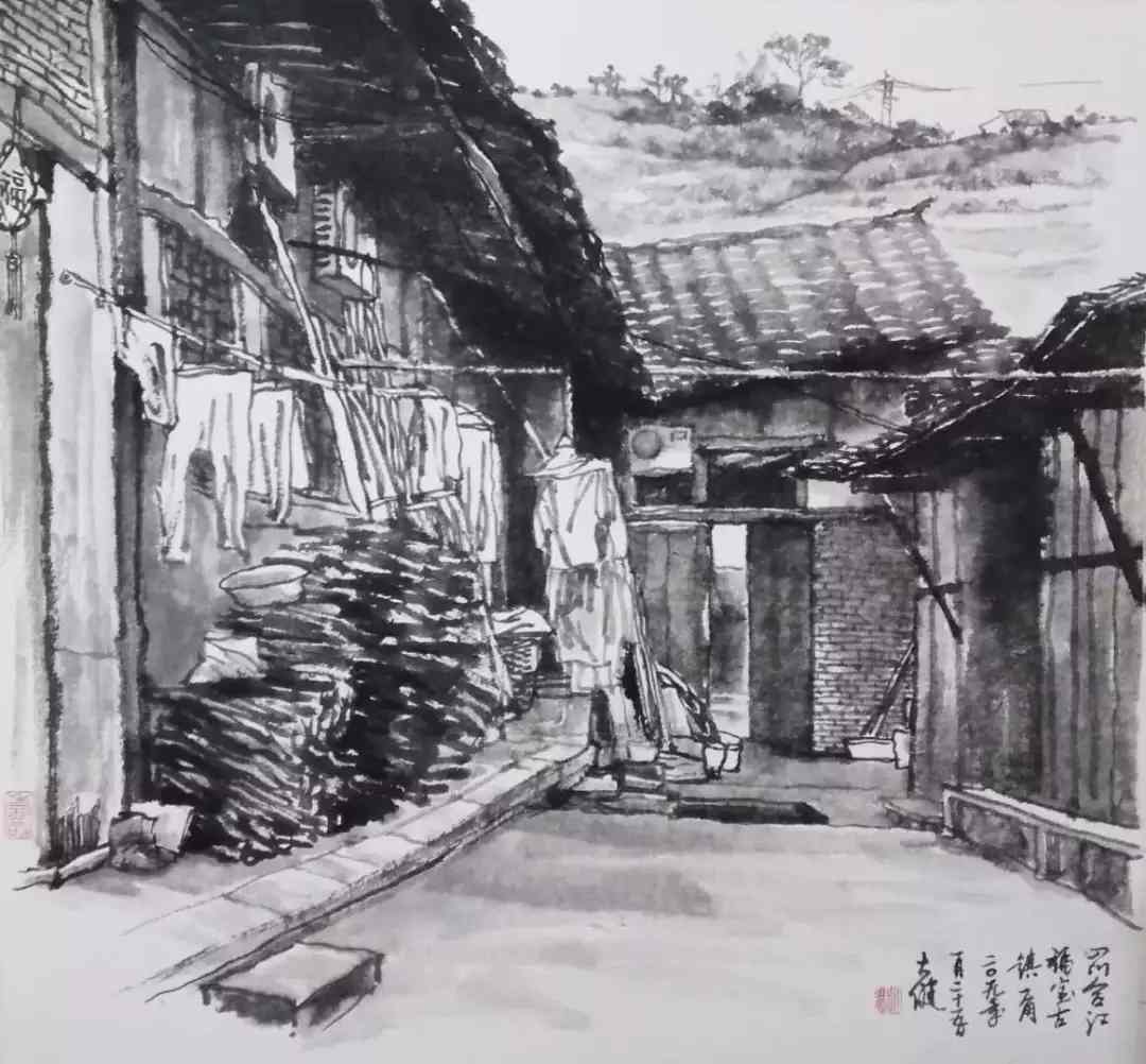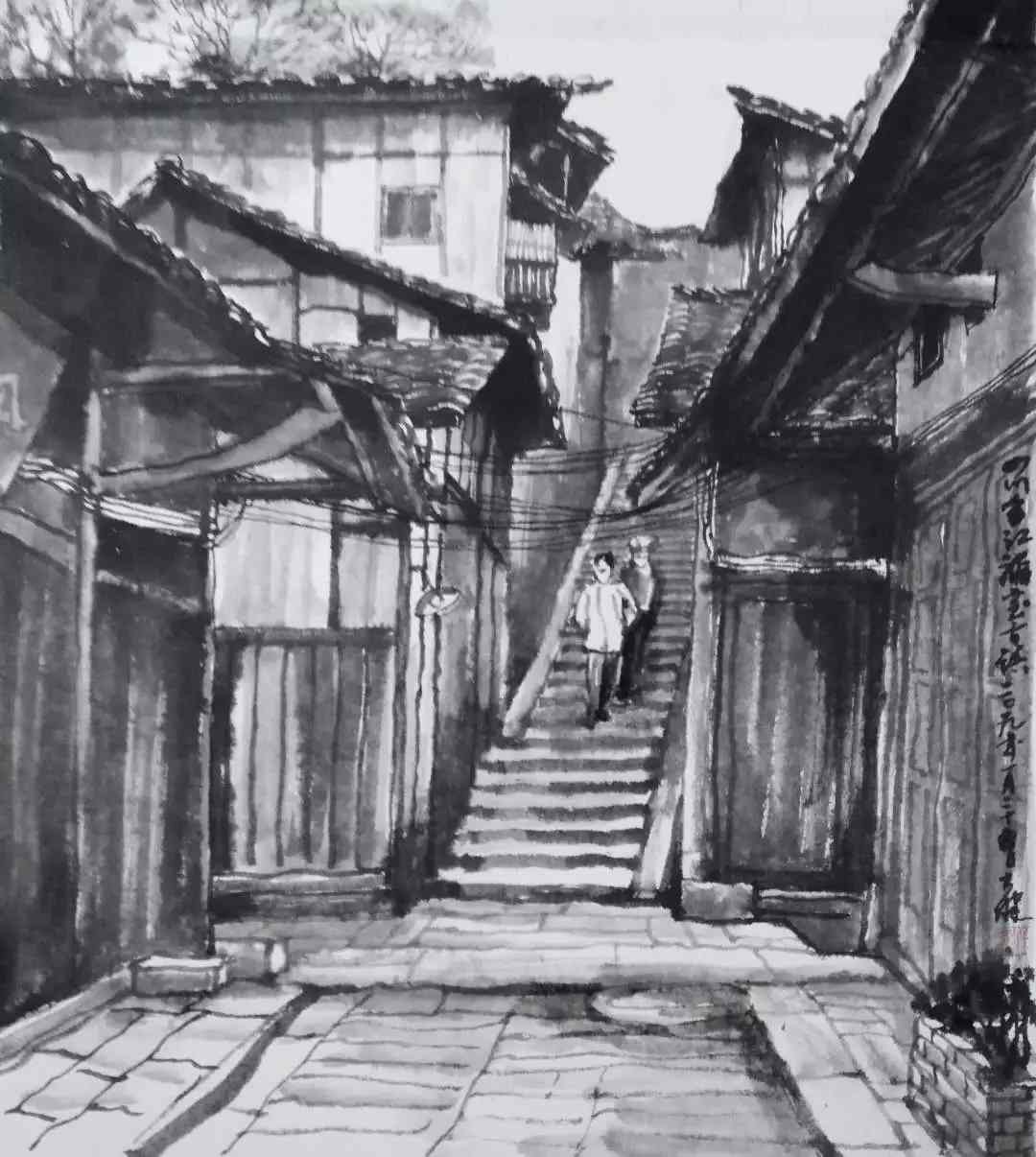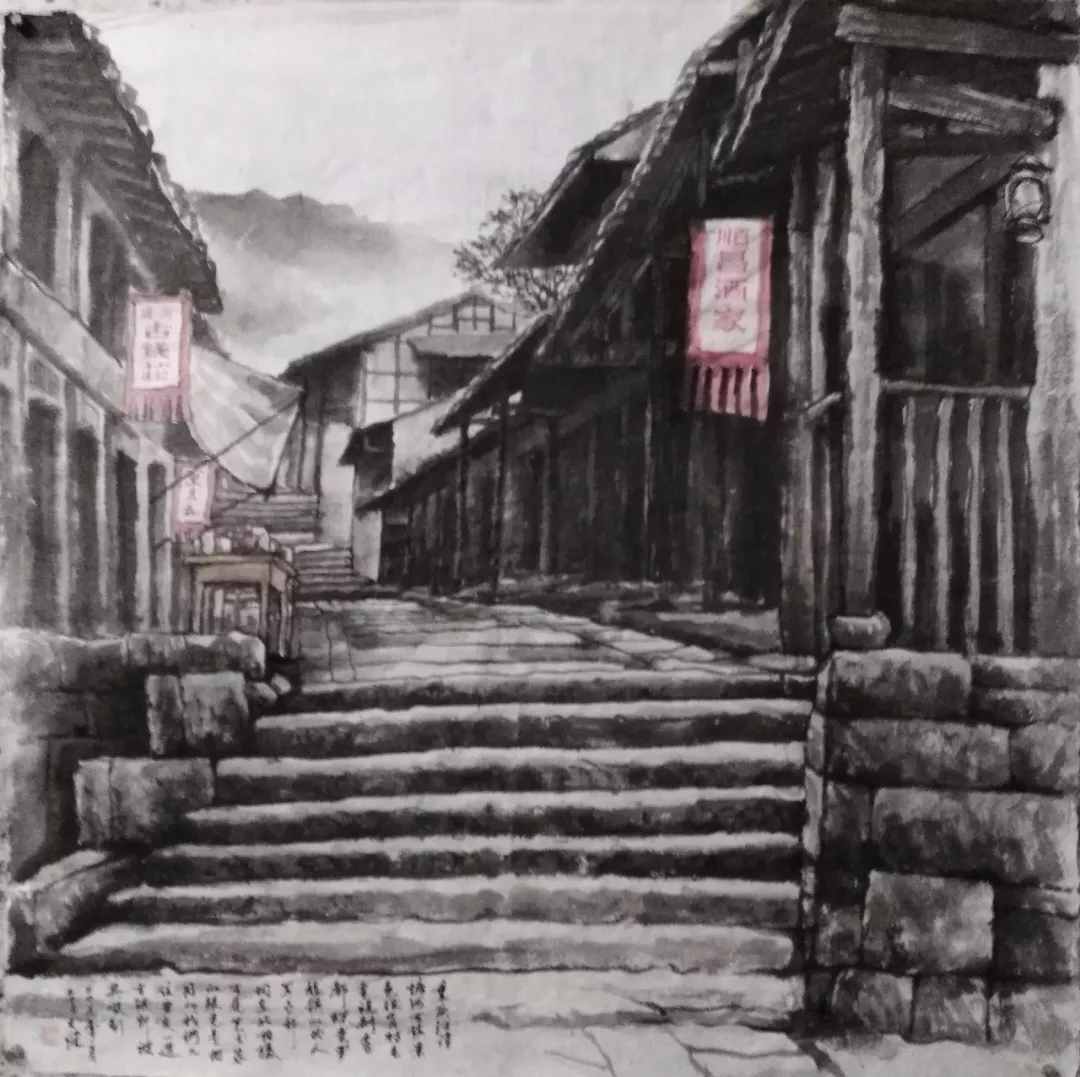 (三)畫中的四川更覺有味,重慶的山城老街古撲醇厚,這種韻味油畫很難呈上,非寫生水墨方可表述,蒼桑在墻檐跡痕中透出,年輪在石扳路上刻下了印記,寫生的用筆,水墨的潑灑,線條在畫紙中盡情走去,這就是她的優勢,發覺大健該畫冊糸列,更顯功力,老辣蒼勁用筆巳如火純青,該是時候了。兄弟已見,大健的走勢定會愈發向上,5年一個飛躍,步白石后塵,其境不可估量也。