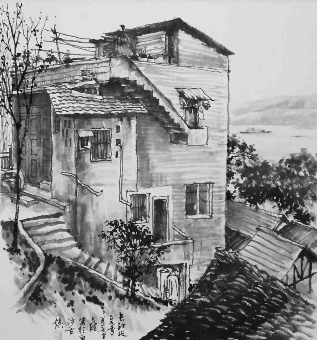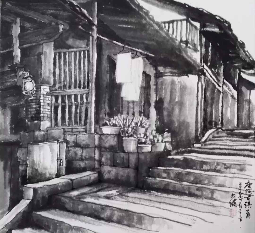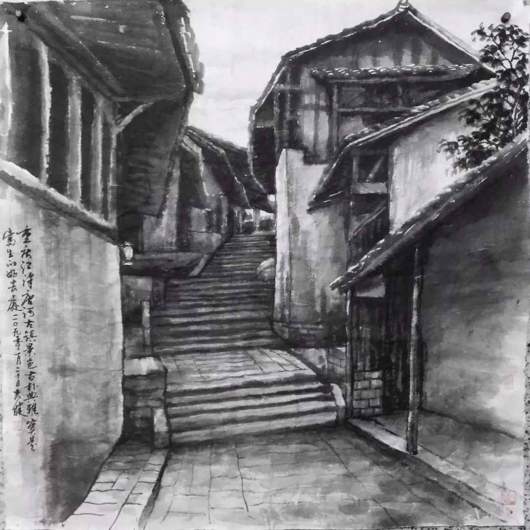 (一)大健的水墨畫在其追型布局上高括提煉,可從其這幾幅畫中不難看出其功力深厚,使人如身臨其境往返連流。從畫中的筆法看,古屋古街高低不等長短參差,上下緊系形若相承。用墨濃淡有別,筆筆得勢,遒健有力,躍在紙上栩栩如真。下筆勁利,實按而虛起,兼有破法搭法,墨色濃淡層次分明,使人有一種一氣呵成之感,充分體現出畫家成竹在胸嫻熟高明的筆墨技巧,讓人欣賞不已。順祝大健步步精進,畫出更好更美的圖畫,讓眾位兄弟再飽眼福。