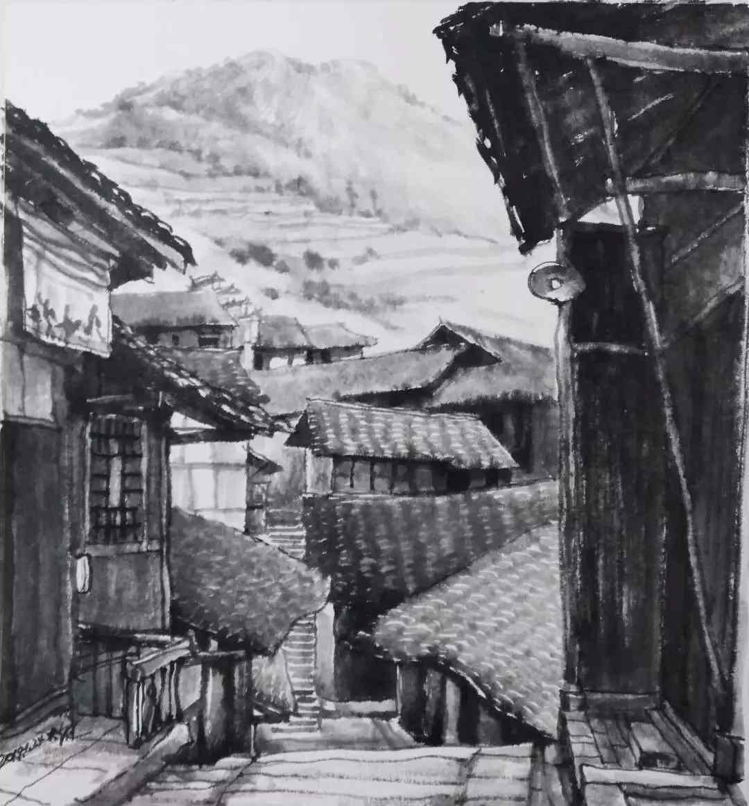 (二)看了大健的寫生新作,為之震撼,士別三日當刮目相看!如薦者所說,這次大健古鎮寫實作品中在對線條疏密對比和墨韻濃淡處理運用自如、得心應手,達到了新的高度,可喜可賀。因此這次組畫好看、耐看,不管是近景木屋,街面,樹木,店幡,蒸氣;還是遠景山巒,云霧,都盡收眼底、真實顯現;特別要說的是畫中懸跨街面的十幾條電線、通信線,畫得真好,極富有現代氣息感。總之,大健這次新畫真的值得你一看,是上檔次的藝術享受,不看你一定會相當遺憾!