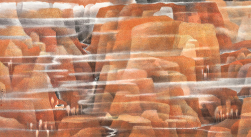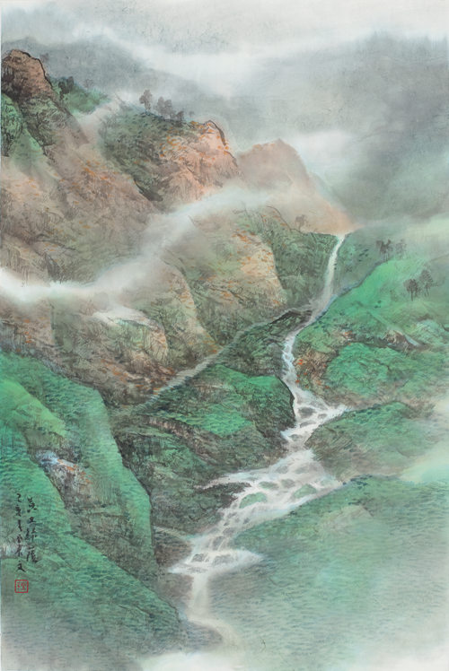 樂震文教授習畫起步于傳統山水,追尋于李唐、范寬,覓跡于遠山、幽谷,積攢了厚實的功底。其浸淫于孔孟之學,陶醉于山水之間,觸景生情,情景交融,以景寫情,寓情于景,一山一水蘊涵著天地人文情懷。他不僅秉承傳統,還續接現代,將構成融入畫中,重組自然形態、色彩、大小和空間,有條理、有規律、有反復的配置演繹節奏的變化,飄浮的流云、流淌的泉水、搖曳的樹枝、起伏的山巒隨著情感的波動呈現出音樂般的旋律。這種節奏與韻律的變化統一,使樂震文的山水畫更具現代形式美感。