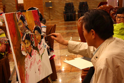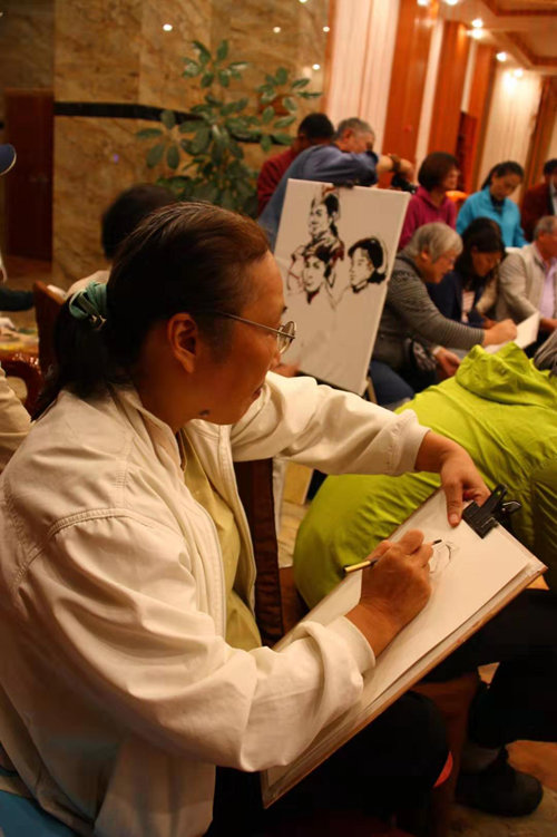 少數民族人物寫生,吸引了許多畫家,由于一天的寫生,大家累了,我以為晚上人物寫生的畫家不會多,想不到,過來一會兒,基本上都到大堂來寫生了,許多畫家的作品還是很精彩的。