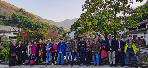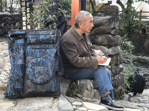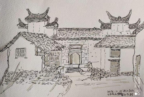 大巴一路駛進山溝,雖值初冬,然秋色斑斕,層林盡染,空山鳥語。鄉村正修道路,駛到梅后,筑路進不了外斜,便在平嶺村頭散開寫生隊伍。