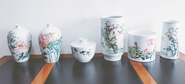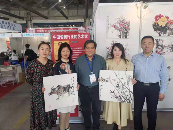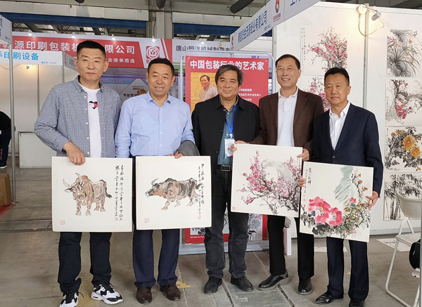 這次夏老師一共帶來的大小尺寸的作品三十多幅,展會第一天就被訂購大部分,許多作品被崔會長當著珍貴禮品送給來參加展會包裝企業家的大佬們,一時之間在夏老師的畫展現場成為中國包裝印刷界企業家的聚集地,大家拿著夏老師的作品合影留念,為展會增加了文化氣息。