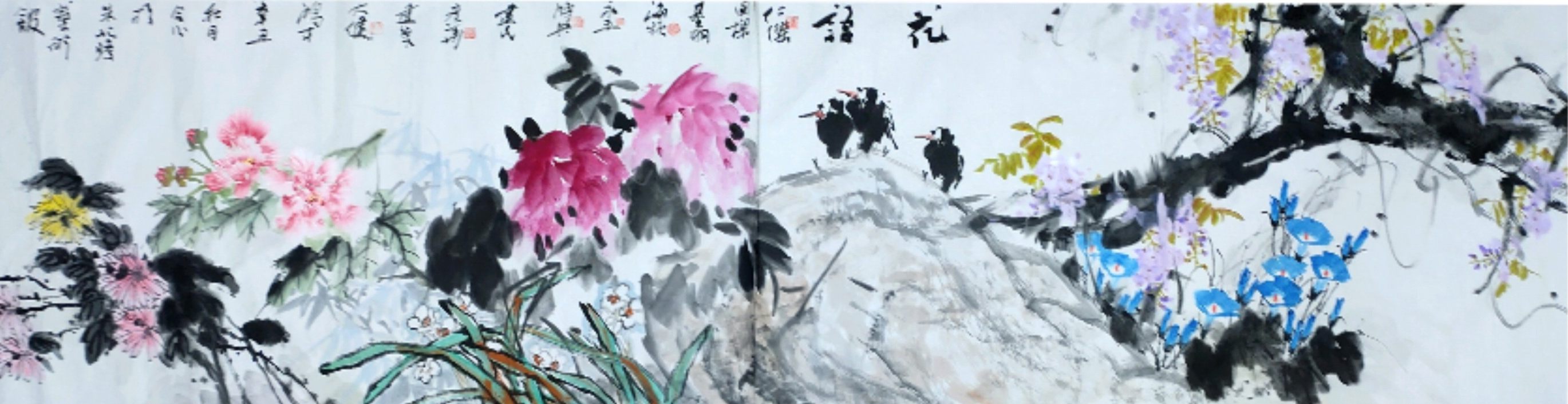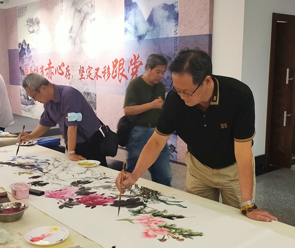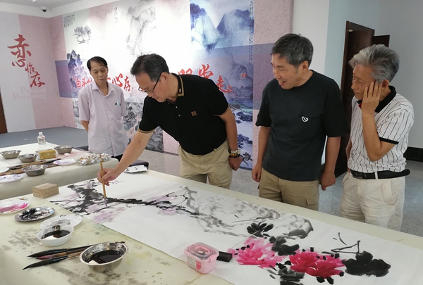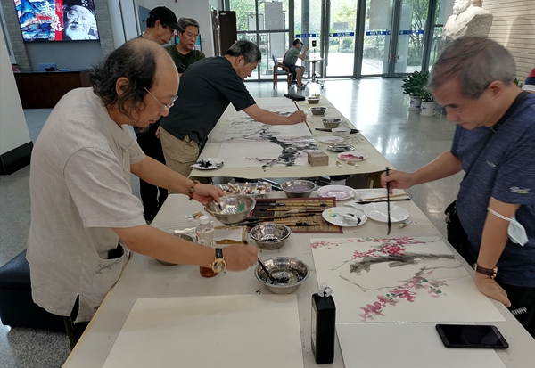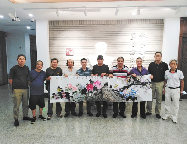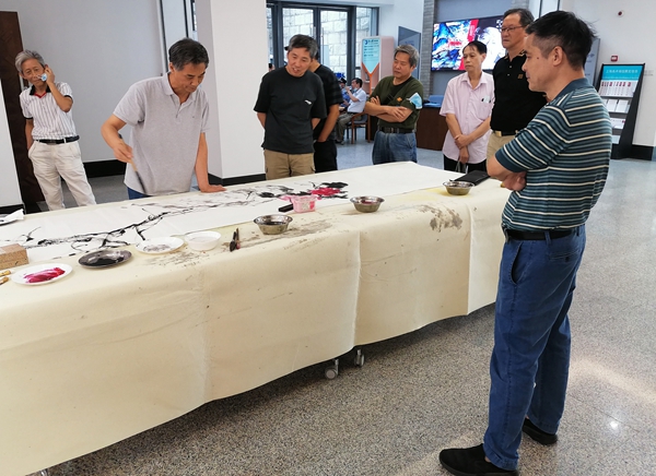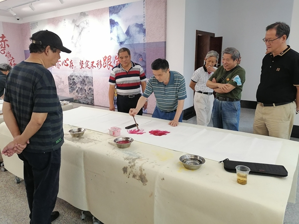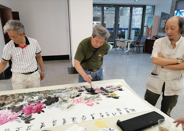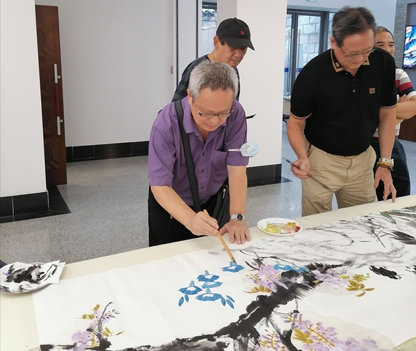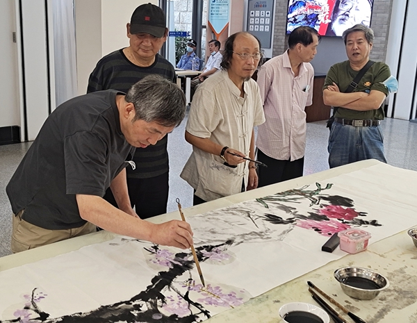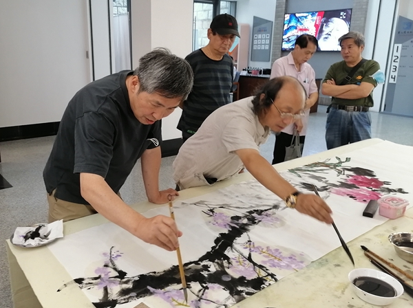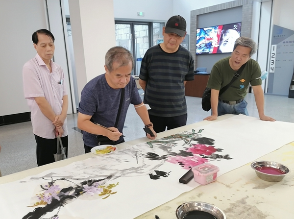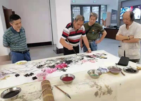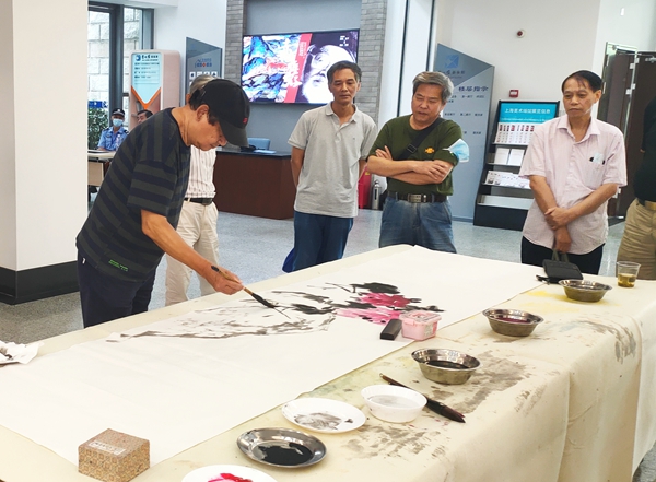 討論會(huì)在熱烈氣氛中進(jìn)行。隨后,畫師們進(jìn)入展廳參觀朱屺瞻誕辰120周年特展,同時(shí)舉行筆會(huì)交流,與會(huì)畫家共同創(chuàng)作了“花語(yǔ)”大幅作品。